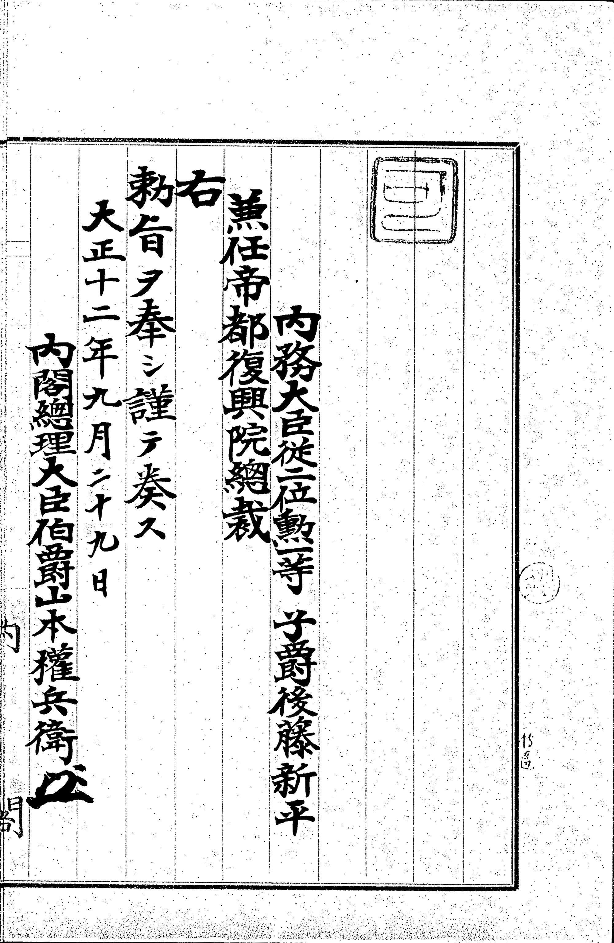 また、翌年の昭和5年(1930年)8月には、「帝都復興記念章」がつくられ、授与の対象者は「帝都復興の事業に直接関与したる者」「帝都復興の事業に伴う要務に関与したる者」と定められました(13)。つまり、この記念章は帝都復興の功労者を称えるためのものでした。(14)では、対象者として、震災当時に内閣総理大臣であった山本権兵衛やその閣僚たちをはじめ、数多くの政治家や行政官たちの名前が挙げられていますが(画像はその一部です)、しかし、この中には帝都復興の道を最初に切りひらいた後藤新平の名前はありません。後藤はこの前年の昭和4年(1929年)4月13日にこの世を去っていました。