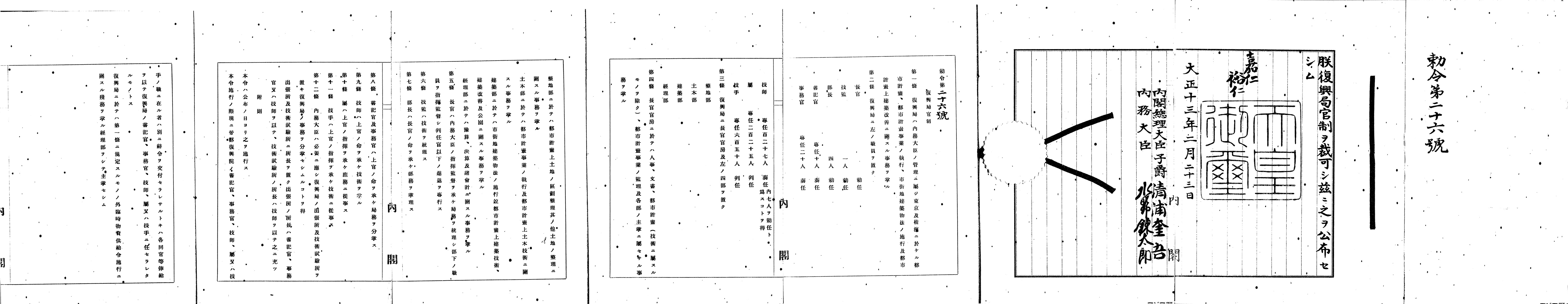 そして、議会のもうひとつの結論として、帝都復興院が大正13年2月に廃止されることになりました。つまり、復興計画が定まった時点で、復興事業を内閣総理大臣が直接管理するという体制は停止されたのです。代わって、計画実行を担うため、内務省のひとつの部局として「復興局」が開設されました(7)。