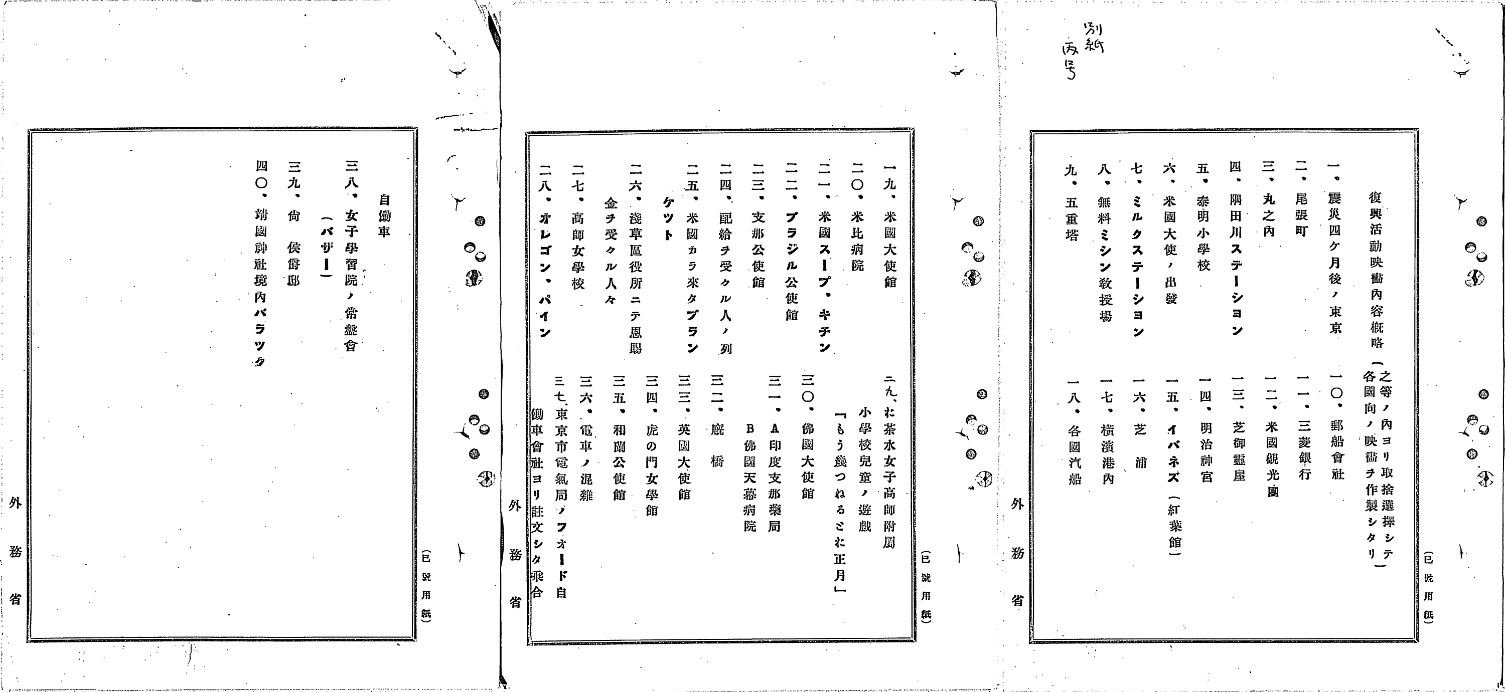 帝都復興の成果は、その当初から大きくアピールされていました。震災発生の数か月後には、「這回の大震災に際し諸外国官民の倚せたる至大の同情援助に対する我国官民感謝の一端を表明し且つ震災及復興等に関する実況を海外に紹介する為」、つまり、諸外国から寄せられた多くの支援に対する感謝の気持ちを示すことや、被害の様子や復興の様子を海外に伝えることを目的として、外務省情報部が映画を製作し、在外公館を通じて各国に配布していました(10)。文部省(現在の文部科学省)でも同時期に同様の映画が製作されているようです。こうしたアピールは、外国からの援助や、特に国債の発行による海外からの資金調達に頼りながら復興を進めていた日本にとっては重要なものだったのでしょう。
