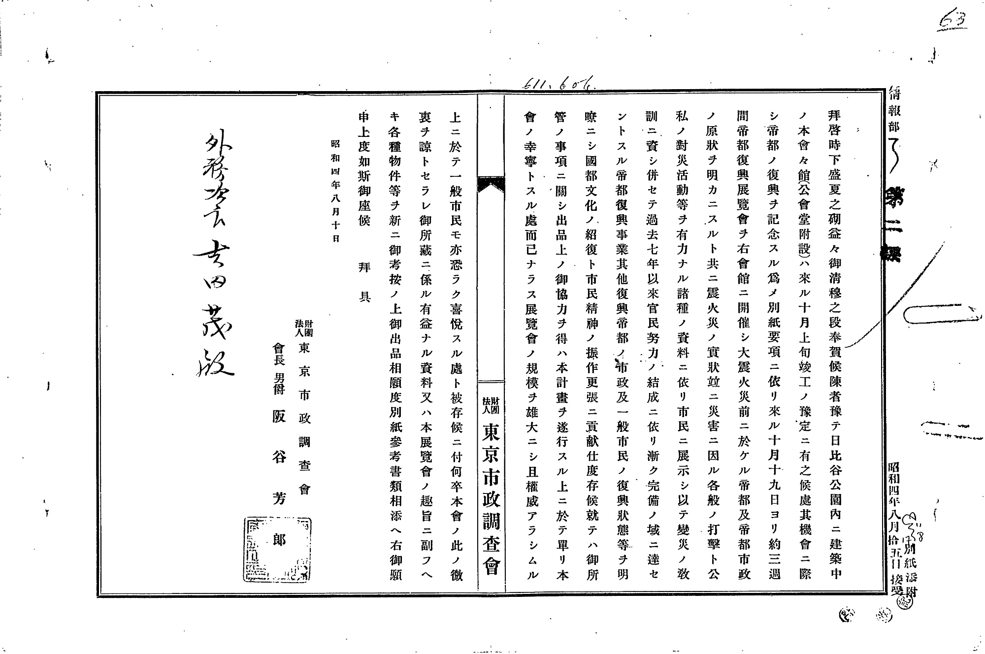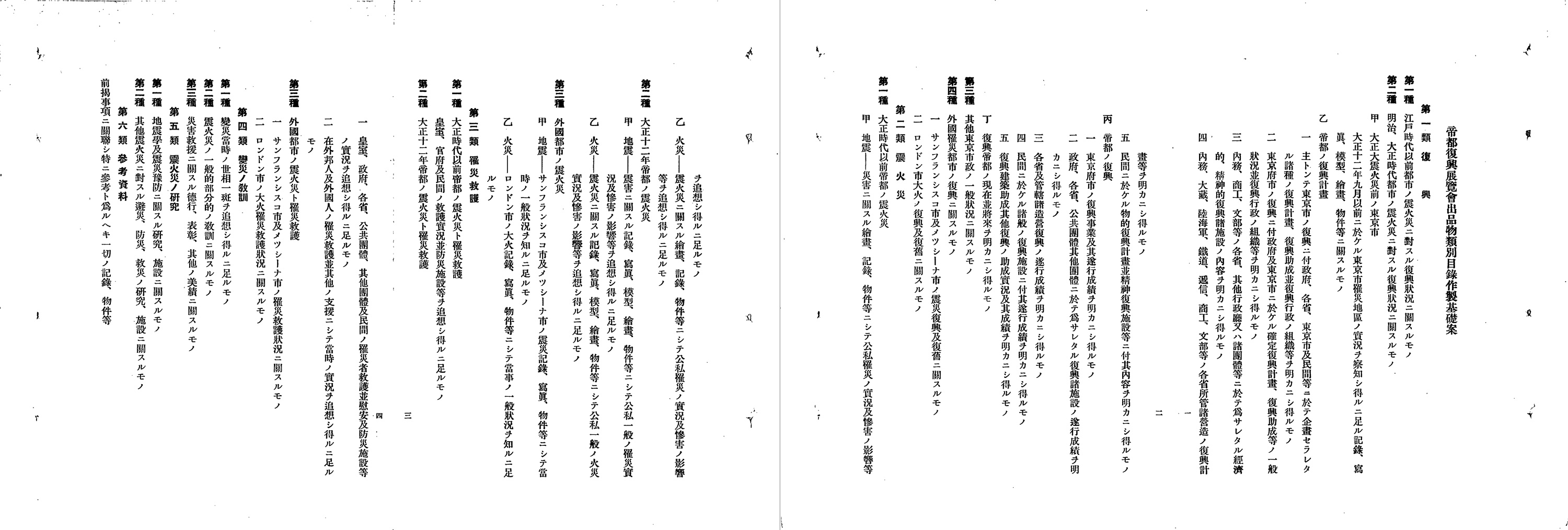 昭和4年(1929年)10月には、帝都復興の達成を記念する「帝都復興展覧会」が日比谷公園内で開催されました。主催者である東京市政調査会(東京市長時代の後藤新平によって組織された研究機関です)会長の阪谷芳郎は、「…過去七年以来官民努力の結成に依り漸く完備の域に達せんとする帝都復興事業其他復興帝都の市政及一般市民の復興状態等を明瞭にし国都文化の紹復と市民精神の振作更張に貢献仕度存候」、つまり、7年間の人々の努力によってようやく達成されようとしている復興の状況を示すことで、首都の文化の再興と人々の精神の高揚に貢献したいと述べています(11)。この展覧会の展示内容は(12)に見ることができます。