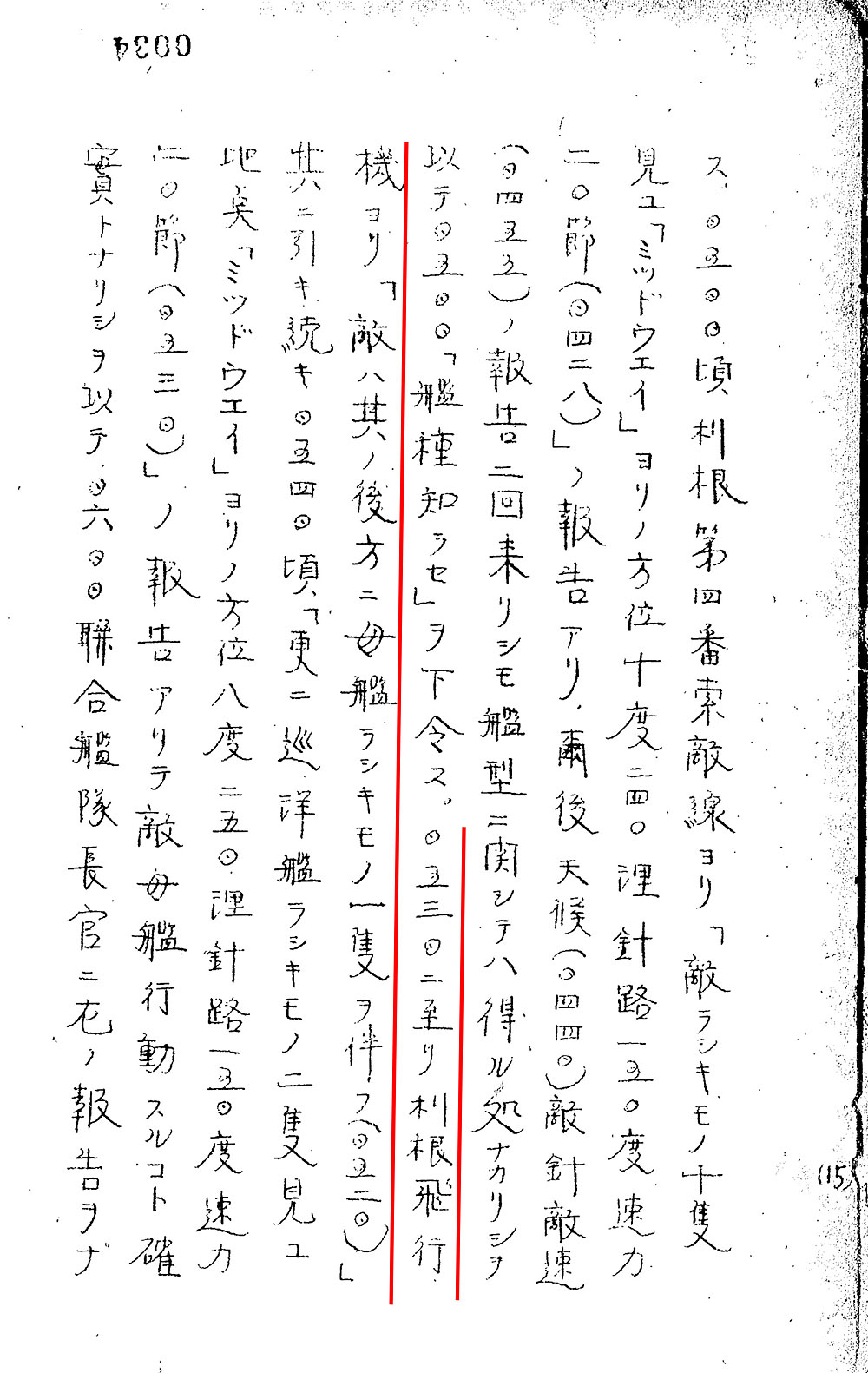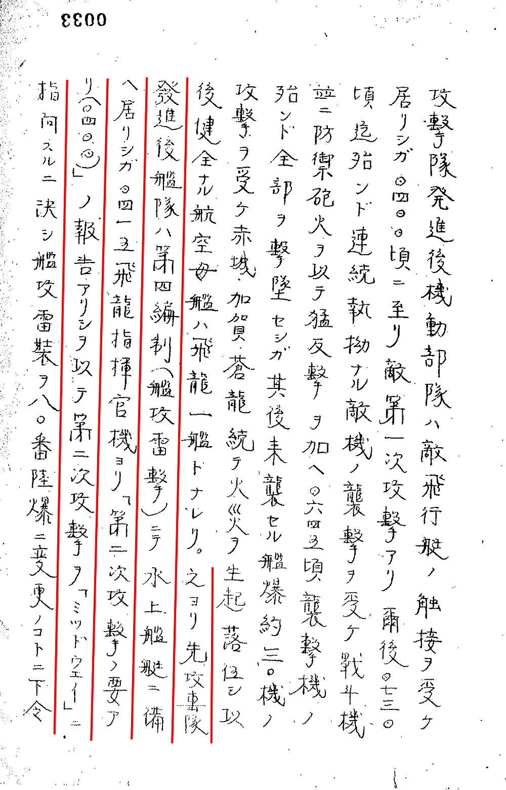 第一次攻撃隊は、3時45分から4時10分の間にかけてミッドウェー基地施設を爆破・炎上させます (2)。ちょうど同じ午前4時頃、アメリカ軍の航空機による攻撃が第一航空艦隊に対し行われます (3)。そして、ミッドウェー基地を攻撃した第一次攻撃隊より「第二次攻撃ノ要アリ」との報告がありました。南雲忠一司令長官は、ミッドウェー付近にはアメリカ艦隊がいないものと判断し、ミッドウェーへの第二次攻撃を決定します。戦闘詳報では、午前4時15分に待機中だった日本軍航空機の装備を艦艇攻撃用から地上攻撃用に転換するのを命じたことが書かれています (4)。