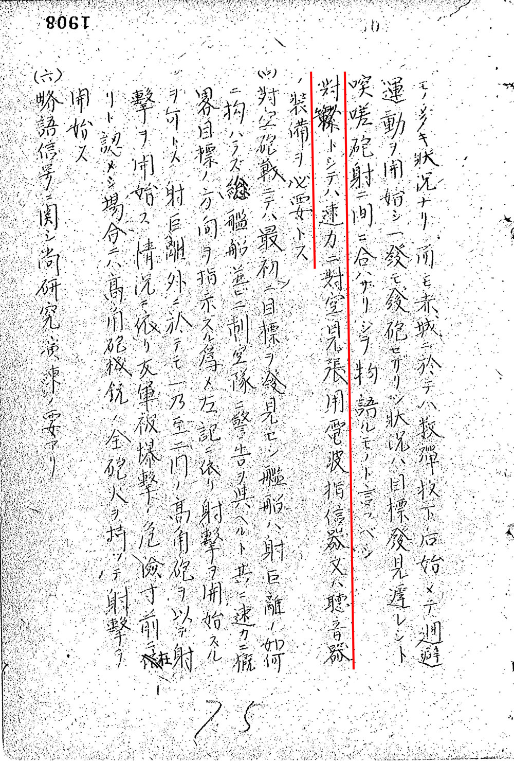たとえば、「飛龍」の見張り施設の性能では5千メートル以上にいる高度の目標の発見は、極めて困難であったことが書かれています。このため後方から襲来した敵爆撃機を発見することができず、「赤城」への爆撃で起きた水柱によって初めて、敵襲を認識した者が多かった、とあります。この事実を踏まえて、対策として対空見張用レーダー等の装備を必要とするとも書かれています (10)。