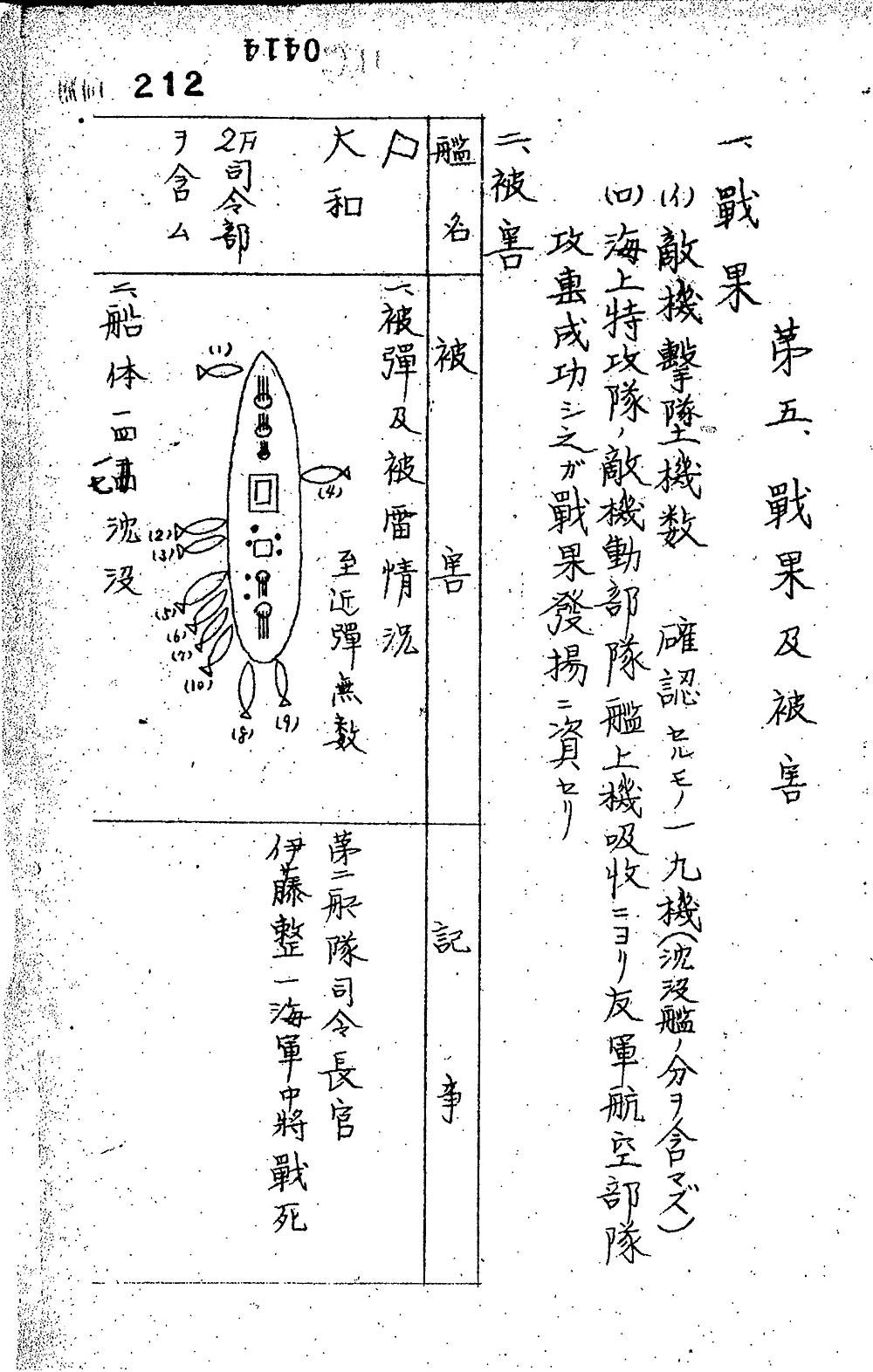 4月7日の8時40分、大和は米軍の航空機の編隊を視認しました。12時34分に「敵艦上機一五〇」に対し射撃を開始しました。しかし、数多くの米軍機からの攻撃を受け、およそ2時間後の14時23分に「前後部砲塔誘爆沈没」しました。 (6) によれば、大和の戦果は撃墜3機、撃破20機、その被害は「沈没(戦死艦長以下2498名)」と記されています。 (7) は大和の被害状況を絵図としてまとめたもの、(8) は戦闘詳報の中に収録されている大和の行動図です。