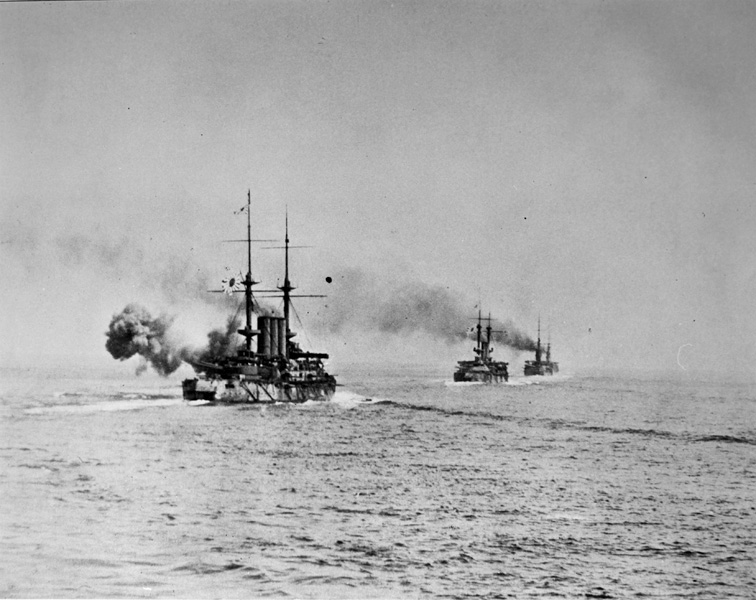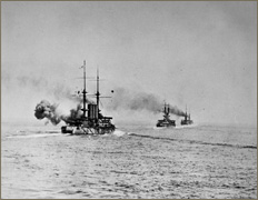 翌10日の朝、ついにウィトゲフト少将率いる旅順艦隊は、大挙してウラジオストックへ向けて旅順港を脱出しようとします。旅順艦隊出港の報告を受けた東郷平八郎は速やかに全戦隊を各配備につかせました(関連資料3)。正午頃、第一戦隊は黄海沖の遇岩の南方において西南西に向かいましたが、旅順艦隊はすでに遇岩の西北西約10浬まで進んでいました。なるべく敵艦隊を外洋に誘致させようとする第一戦隊に対し、旅順艦隊は南東に向かって逃れようとしました。しかし、両者の間は徐々に縮まっていきます。午後1時15分、日本側より遠距離射撃を開始し、ロシア側もこれに応戦しました。第一次合戦の始まりです。