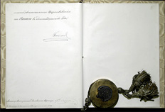 明治38年(1905年)11月25日、日露両国間で講和条約批准書が交換されます。この資料は、批准書交換の任を負うことになる駐米特命全権公使高平小五郎への委任状下付に関する外相小村寿太郎による上奏文です。日付は、明治38年(1905年)10月24日と記されています。