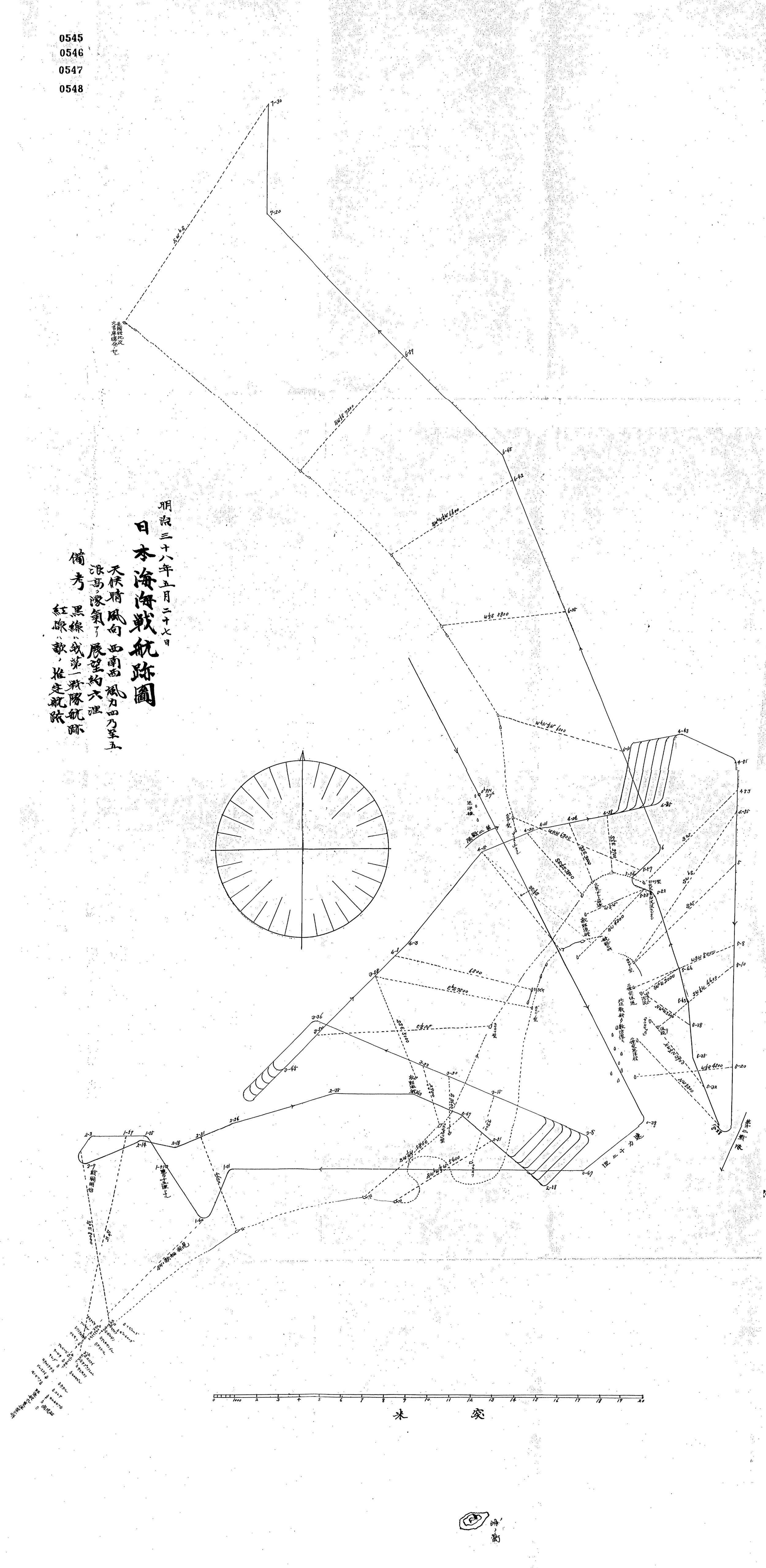 26~28画像目は、「明治三十八年五月二十七日 日本海々戦図」と題された図で、上の「日本海海戦航跡図」の左図(19、22画像目)の右側中央部分にあたる内容です(異なる点もあります)。ここには27日日中の戦闘の際の日露両艦隊の動きが示されています。南方(図の下方)から北上してきているのがロシアのバルチック艦隊です。図下方(28画像目)の中央辺りで円のような形を描いている日本艦隊の動きが、「T字戦法(丁字戦法)」と呼ばれているものです。30~31画像目は、「明治三十八年五月 日本海々戦航跡図」と題された図で、上の「日本海海戦航跡図」の右図と左図をあわせたような内容ですが、28日の戦闘以降の航跡は、舞鶴への帰港ではなく再び対馬方面への南下となっています。