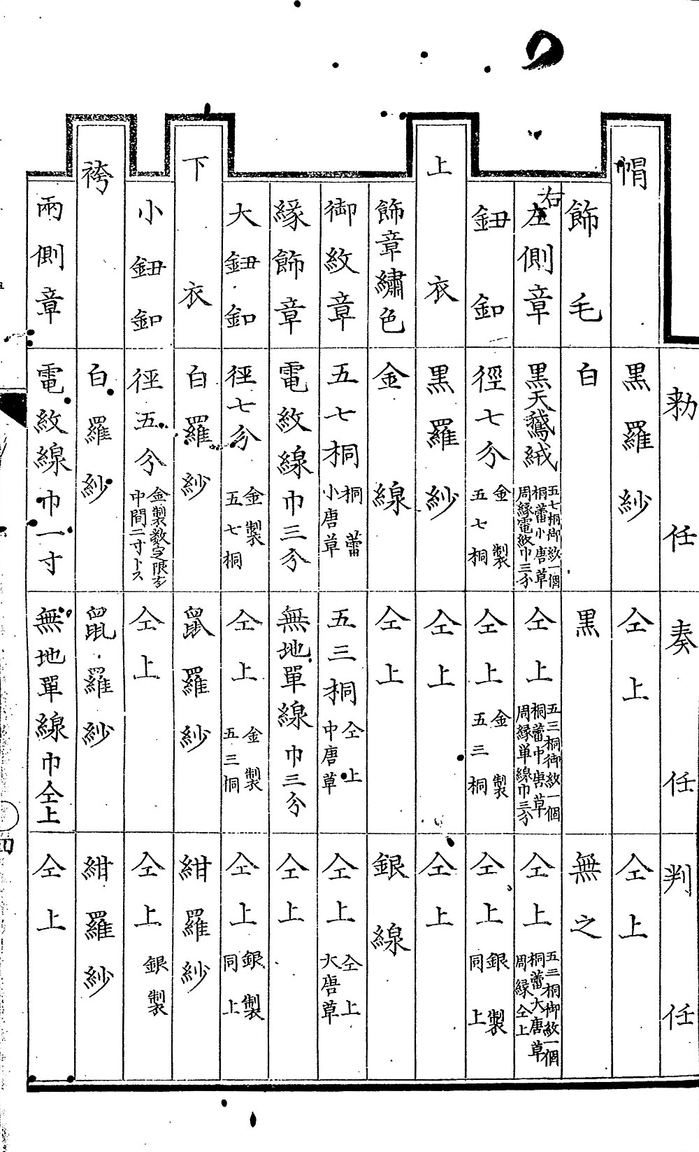 男性用の洋服は、すでに幕末には軍隊などで用いられていましたが、明治初期に官僚の制服が洋装になったことで、その後、民間にも徐々に普及していきます。最初に文官(官僚のうち軍事以外の行政事務を取り扱う者、文民の官僚の総称)の礼装である大礼服の体裁を定めたのが、明治5年制定、太政官布告第339号の「大礼服汎則」です。 (2) はこの中の一部で、勅任官・奏任官・判任官(文官の位)の大礼服について、帽子・上衣・下衣の服地や寸法、飾章の入れ方、ボタンの付け方まで詳細に示した表です。(3) は、勅任官の帽子などを図示したものです。他にも、上着やズボン、襟の模様など、その形式の規則が図によってかなり詳しく示されています。(レファレンスコード:A07090082600 単行書・大礼服制表並図・勅奏判官並非役有位部附上下一般通常礼服)