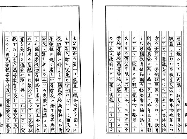 このような学校制度は、昭和22年(1947年)に教育基本法と共に制定された学校教育法で定められたもので、明治期以来の戦前の学校制度が大きく変更されるかたちで成立しました。 (1) は学校教育法案を審議した際の会議録です。冒頭部分に、変更の理由として、