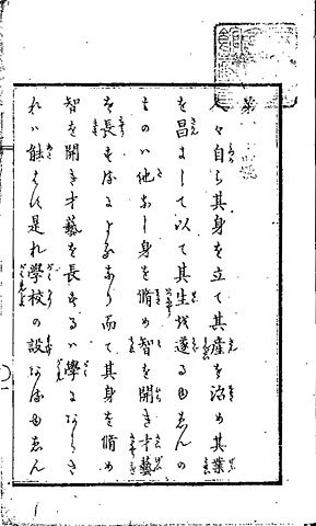日本最初の近代学校制度は明治6年(1873年)に、フランスを模範とする中央集権的な「学制」として定められます。「学制」では学校制度が大学・中学・小学の三段階と定められ、国民に教育の機会が開かれました。(2) は「学制」の序文です。ここには「人々自ら其身を立て其産を治め其業を昌にして以て其生を遂るゆゑんのものは他なし。身を脩め智を開き才藝を長するによるなり。而て其身を脩め智を開き才藝を長するは學にあらされは能はす。是れ學校の設あるゆゑん(道徳を身につけ、能力を引き出し伸ばすことを学び、立身出世を可能にするのが学校である)」と明示されています。また、小学校は「人民一般必す学はすんはあるへからさるものとす(国民は必ず学ばなければならないこととする)」と就学義務のある8年制の学校(下等小学校4年、上等小学校4年)として規定されました。しかしながら、授業料や学校の建設・維持費などは教育を受ける主体、つまり国民が負担することとされており、負担に耐えかねた人々の中からは学制反対一揆が起こることもありました。
