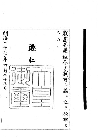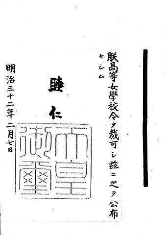 このように戦前の学校制度が複雑であった理由は、先に見た「小学校令」のように、学校ごとに個別の勅令(天皇大権によって制定された法令)によって規定され、統一的な制度に基づいていなかったためです。戦後の学校制度ではこの複雑な学校制度を単純化する、つまり法令に基づく一元的な体系に整備しようとしたのです。 (5)、(6)、(7) はそれぞれ、中学校令、高等女学校令、高等学校令を公布した御署名原本の冒頭部分です。
