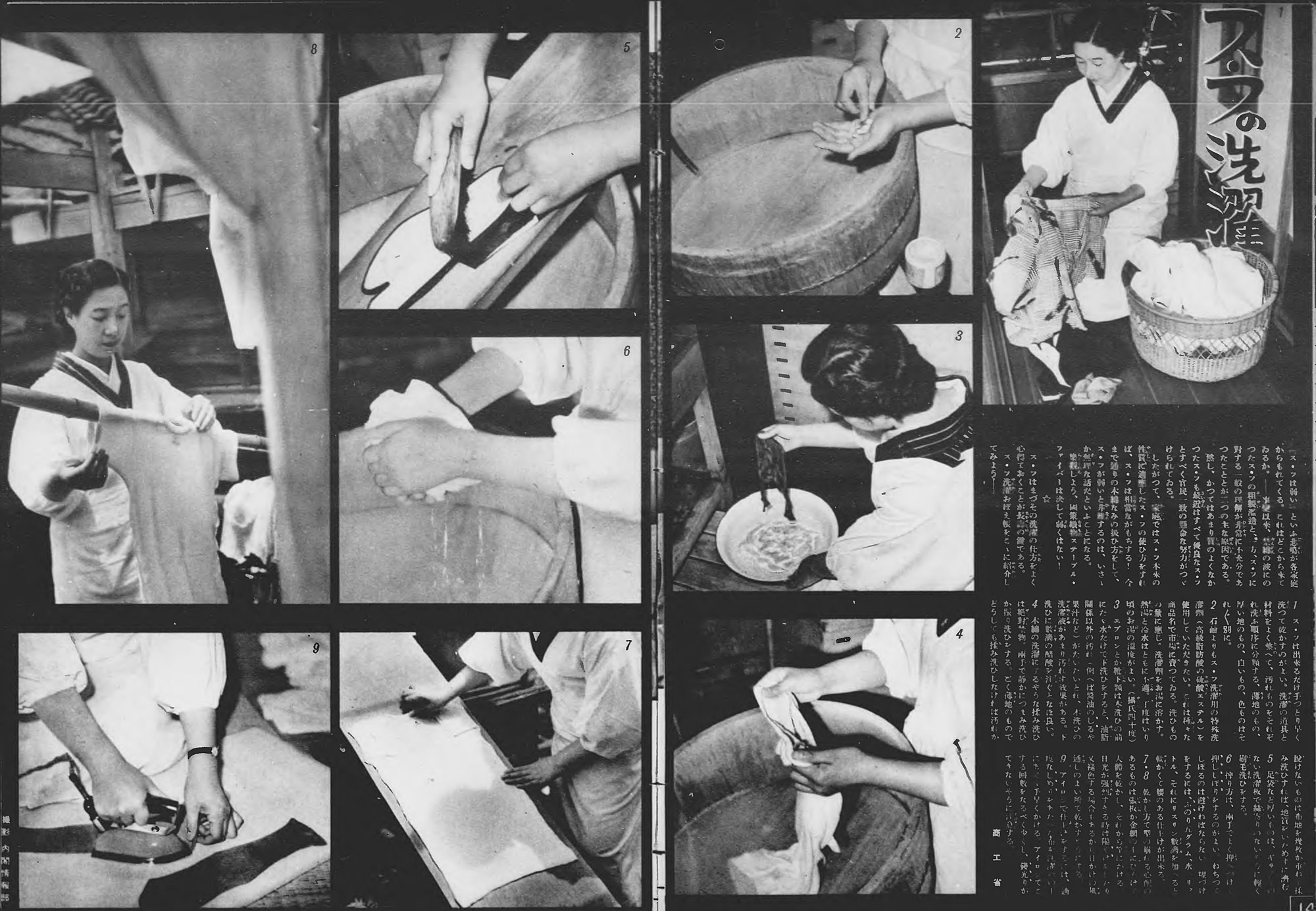 (5) は、洗濯についての記事です。「ス・フの洗濯」というタイトルが付いています。「ス・フ」というのは、ステープル・ファイバー、つまり化学繊維の一種です。当時は日中戦争の最中で天然繊維の原料が不足していたため、この「ス・フ」の使用が国によって奨励されていました。記事は、この素材でできた衣料をどのように洗濯したら良いか、という主婦向けのガイドになっていますが、その意図は、「国策繊維」とされる「ス・フ」が非常にすぐれたものであることをアピールすることにありました。こういったところには、当時の独特の空気が感じられます。