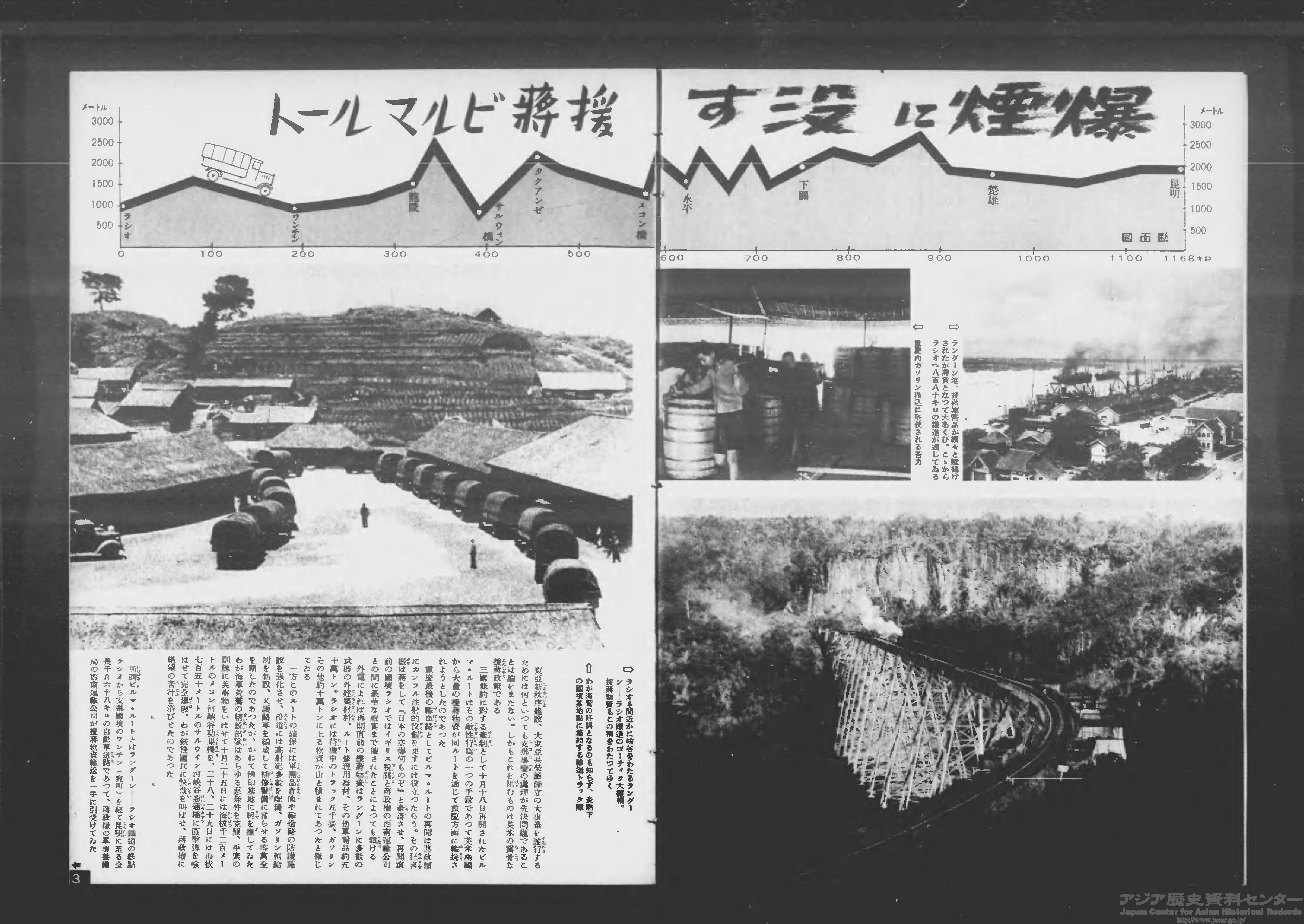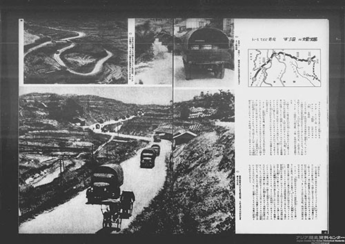 北部仏印への進駐は、国民政府への支援ルート(援蒋ルート)の遮断、資源獲得を意図して行われました。上の記事(1940年11月13日)は「援蒋ビルマルート」と、日本軍による爆撃について解説しています。