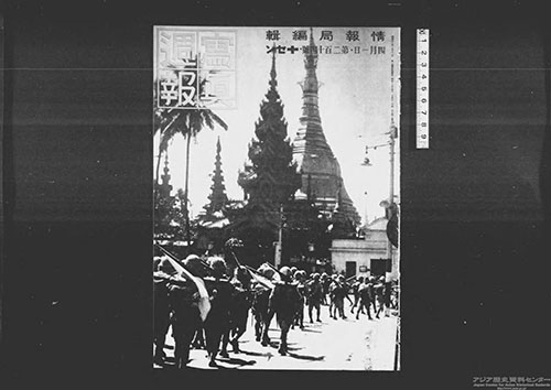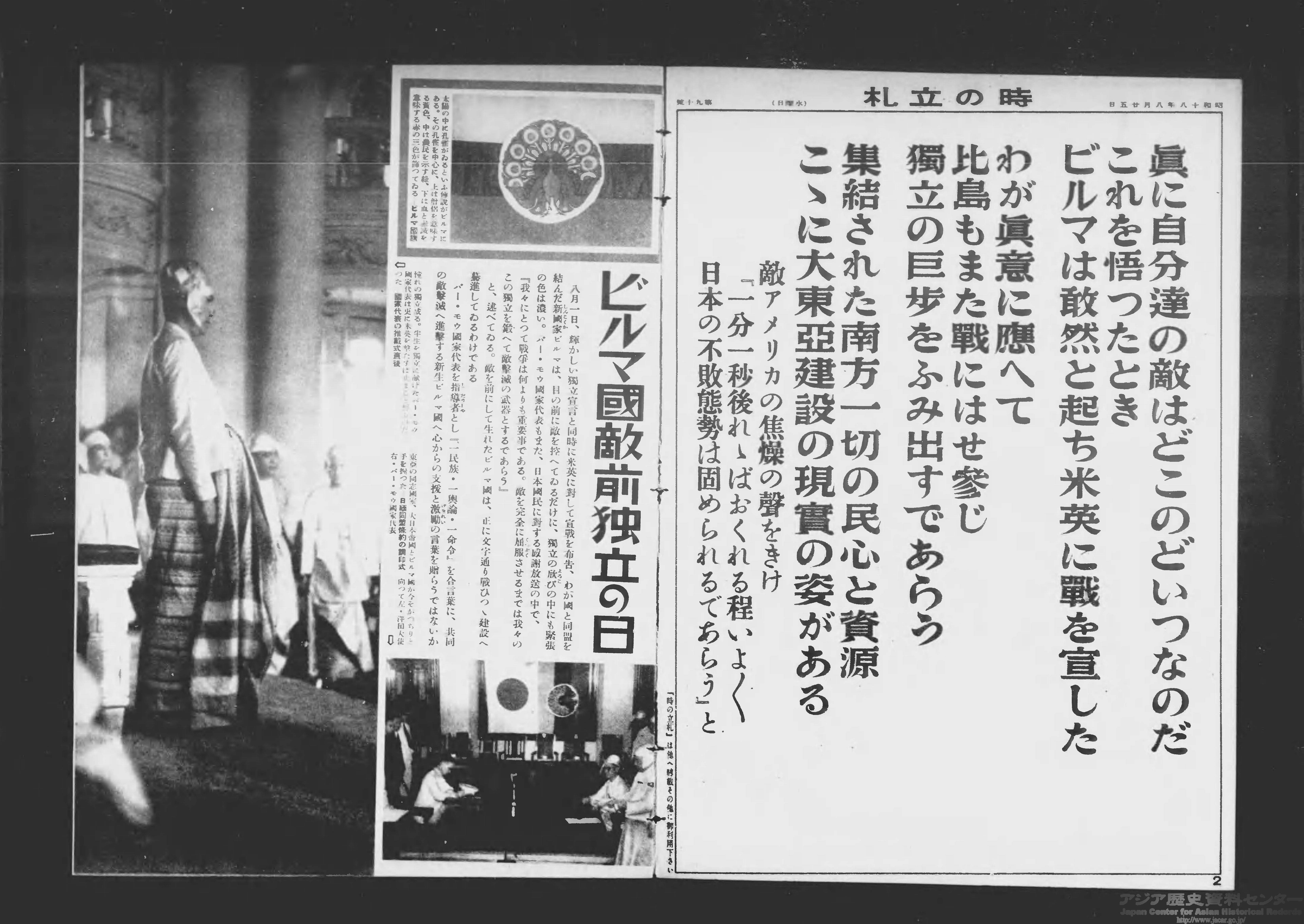 ビルマでは8月1日にバー・モウを元首として独立が宣言されました。『写真週報』は「ビルマ国敵前独立の日」と題してこれを報じました(1943年8月25日号)。