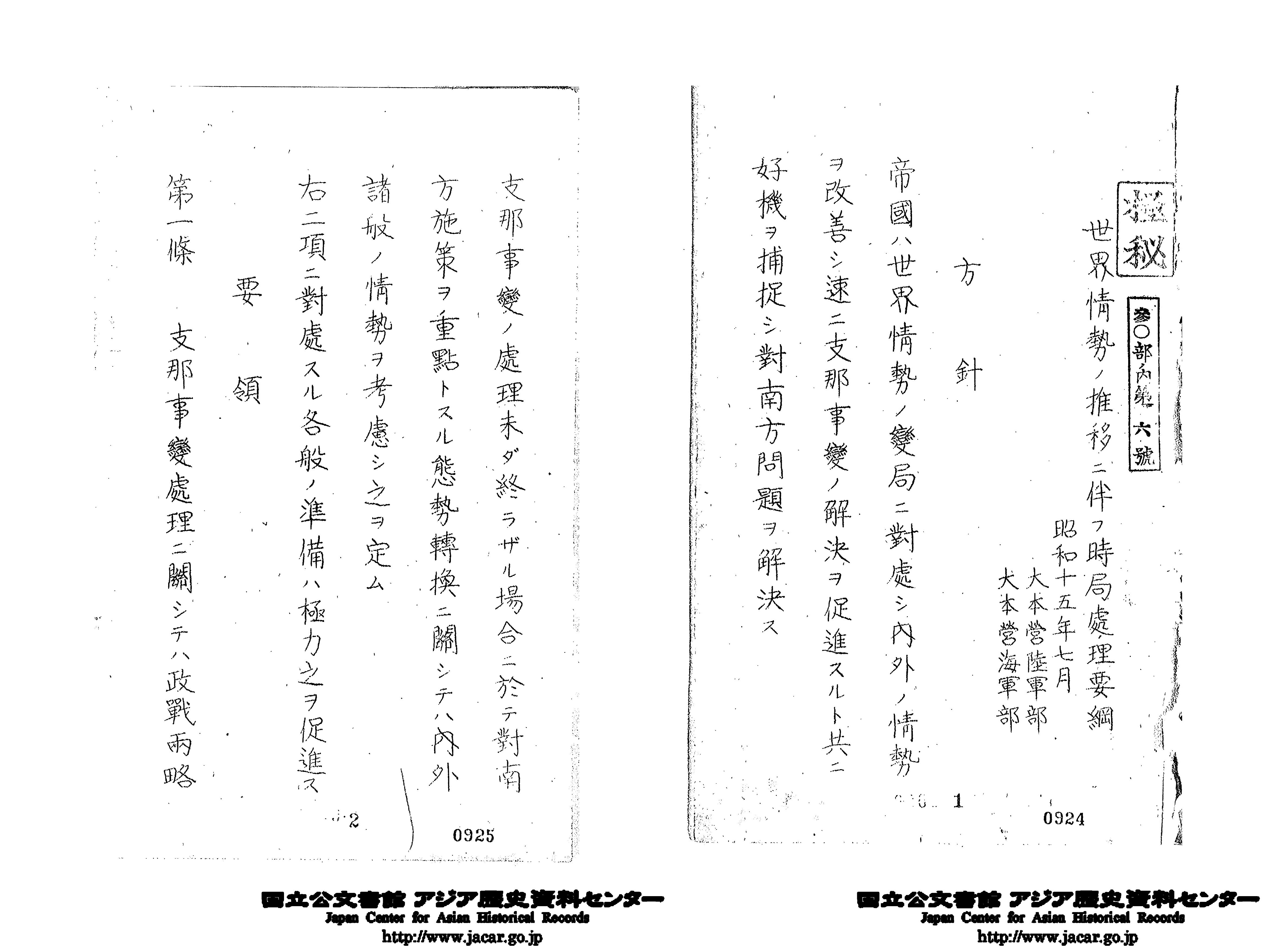 「世界情勢の推移に伴ふ時局処理要綱 昭和15年7月」(Ref. C12120200800)1~2画像目