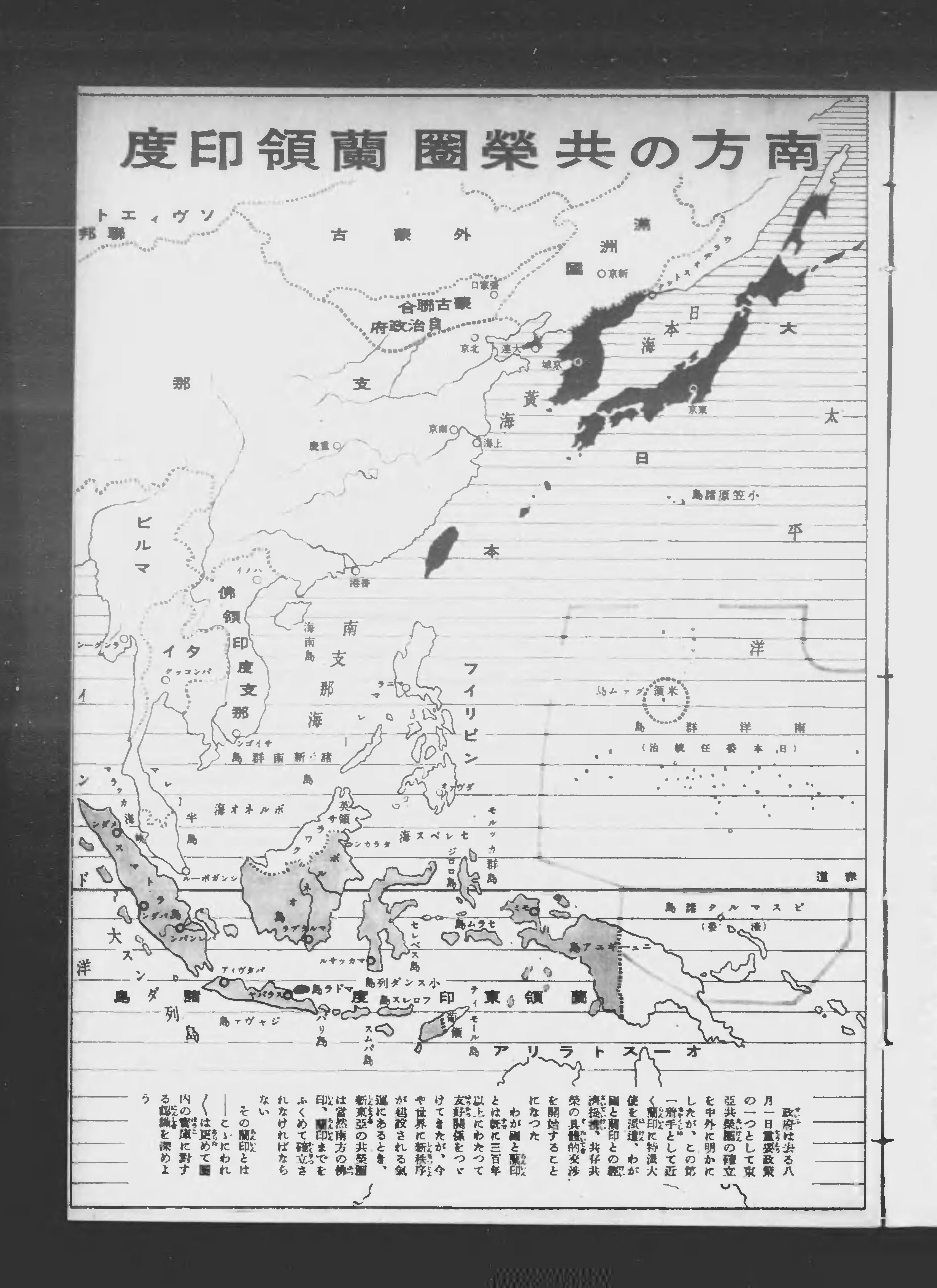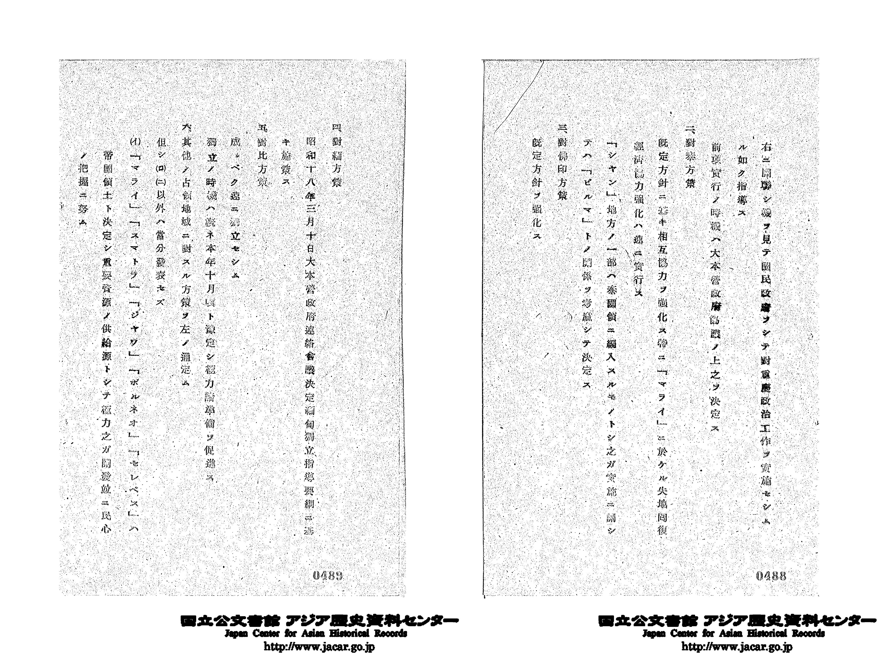 汪兆銘政権と同盟条約の締結を目指し、ビルマおよびフィリピンは独立、マライ、スマトラ、ジャワ、ボルネオ、セレベスは帝国領土とすることなどが書かれています(インドネシアはのちの1944年9月、小磯國昭首相により将来の独立容認が言明)。