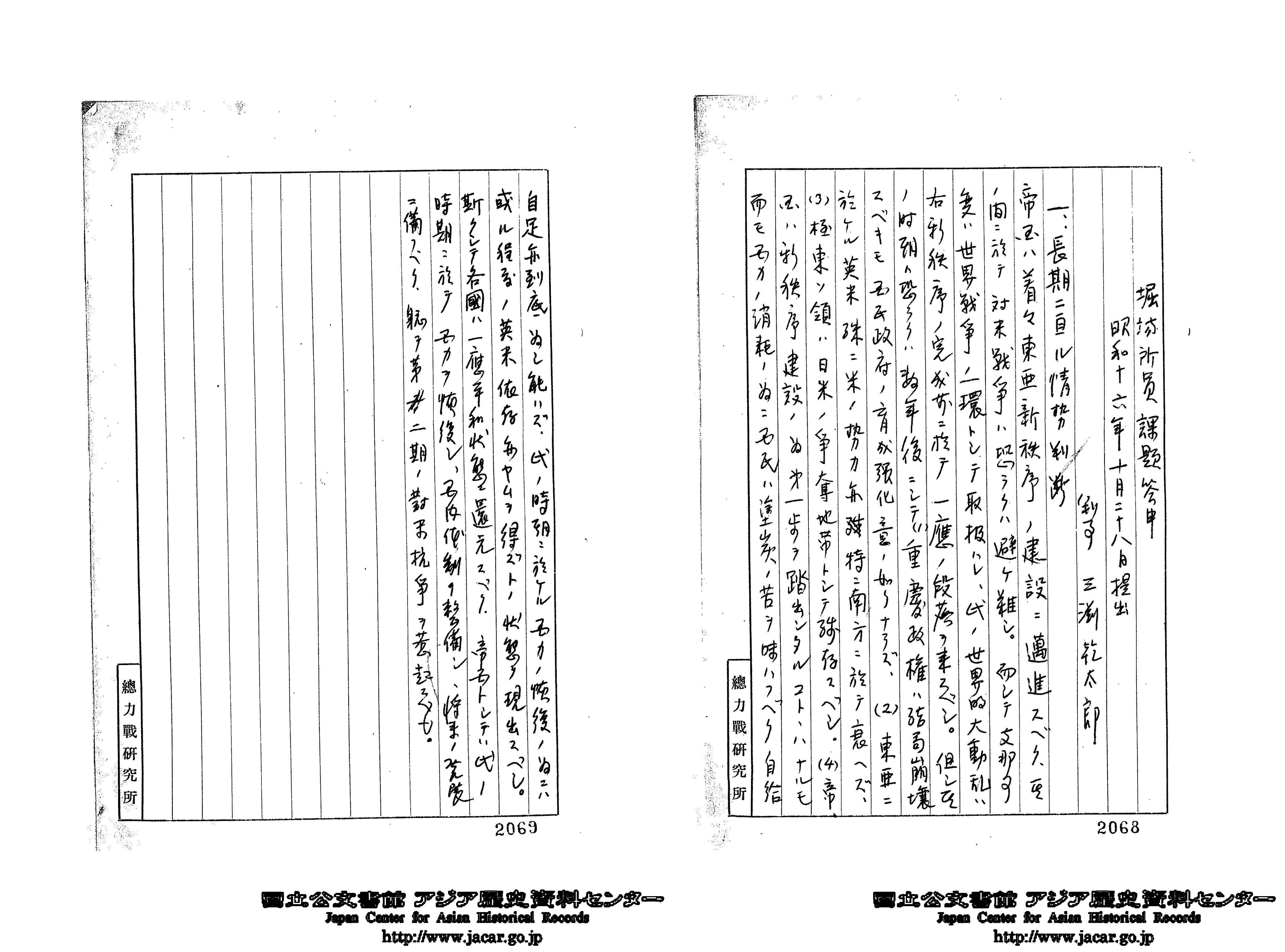 この資料は1941年10月、総力戦研究所の第1期研究生が取り組んだ課題作業「長期に亘る東亜将来の情勢判断」の答申(回答)をまとめたもの。日本が対英米戦に勝利してアジア各地を支配下に収めるという予想もあれば、その困難を予想するものもあります。画像は研究生で判事の三渕乾太郎の回答です。