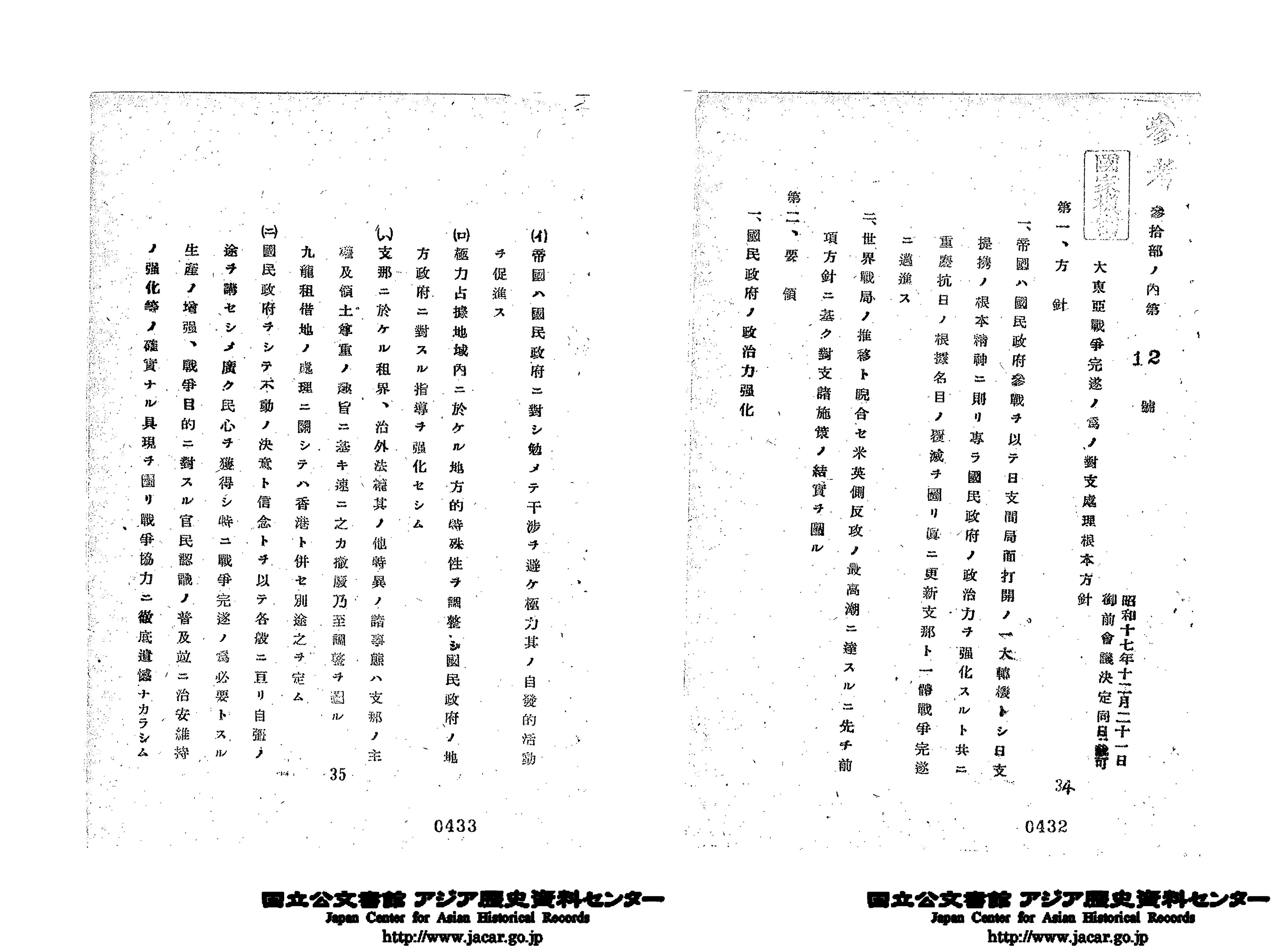 「其1 参考資料 内閣準備書類/7、大東亜戦争完遂の為の対支処理根本方針 昭和17年12月21日」(Ref. C12120194300)1~4画像目