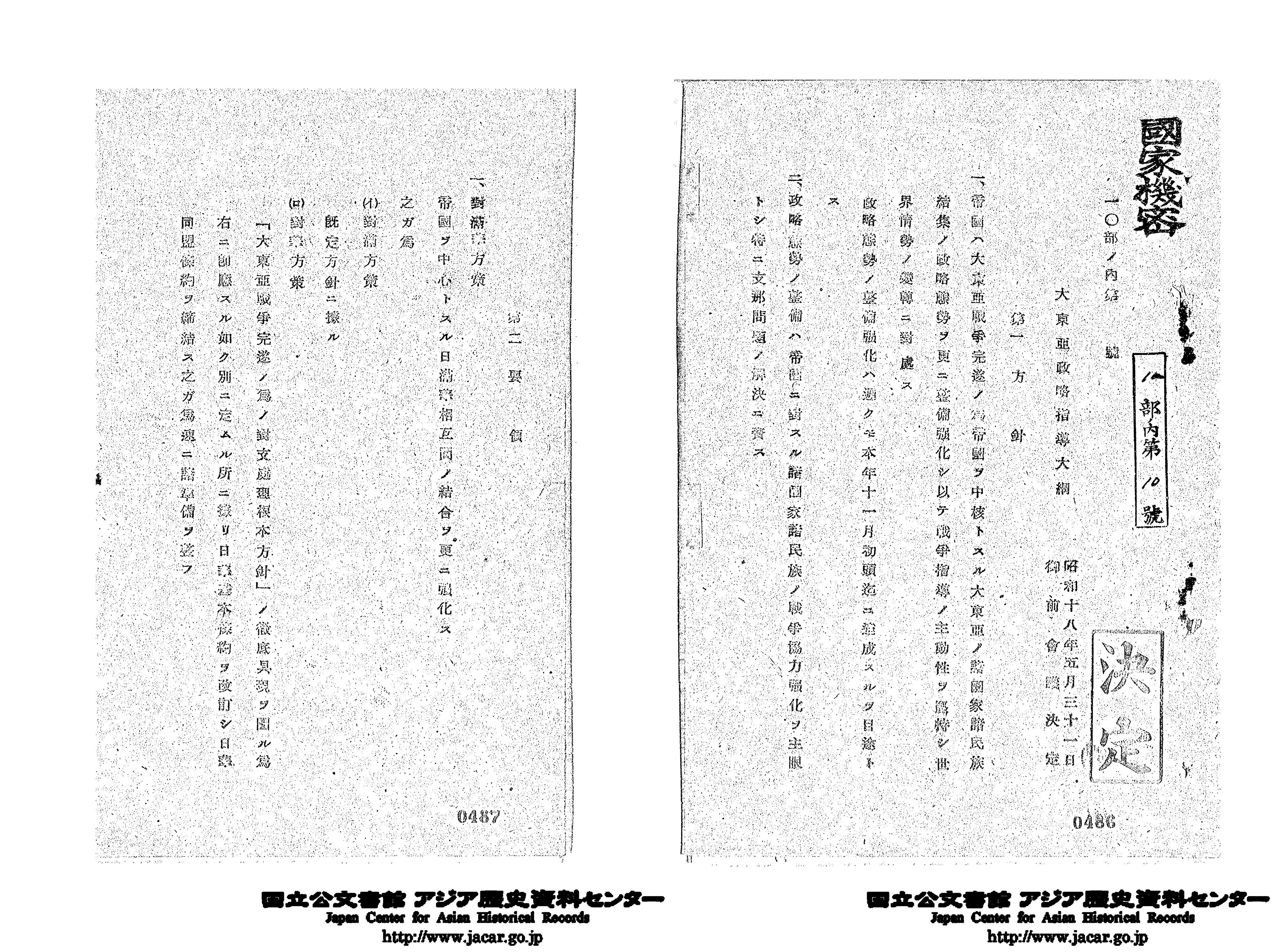 「昭和18年5月31日 大東亜政略指導大綱」(Ref. C12120280400)1~4画像目