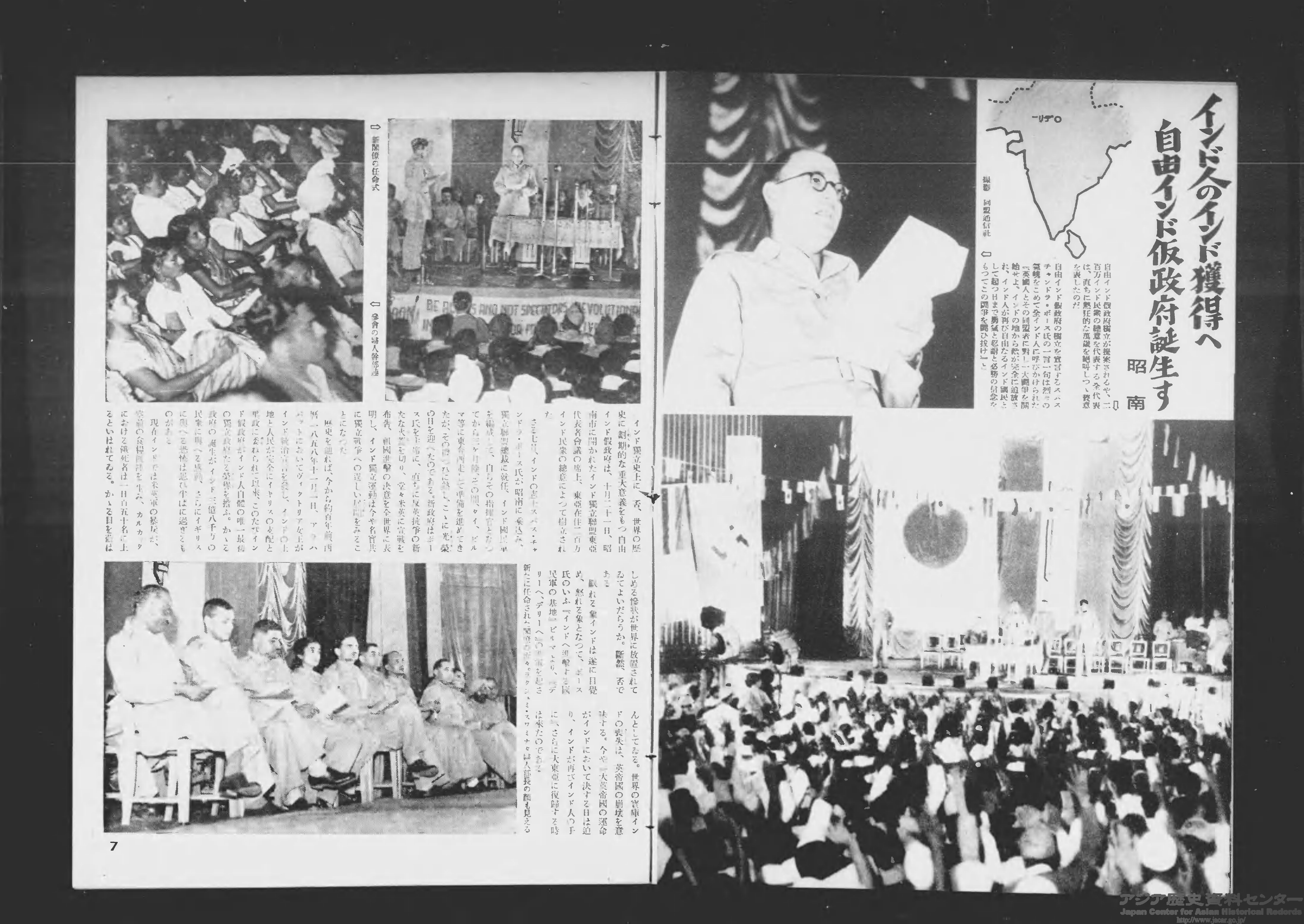 1943年10月21日、日本軍政下のシンガポールで、インドの独立運動家スバス・チャンドラ・ボースのもと、自由インド仮政府の樹立が宣言されました。『写真週報』では1943年11月10日号でこれを取り上げるとともに、11月17日号はボースの肖像が表紙に掲載されました。