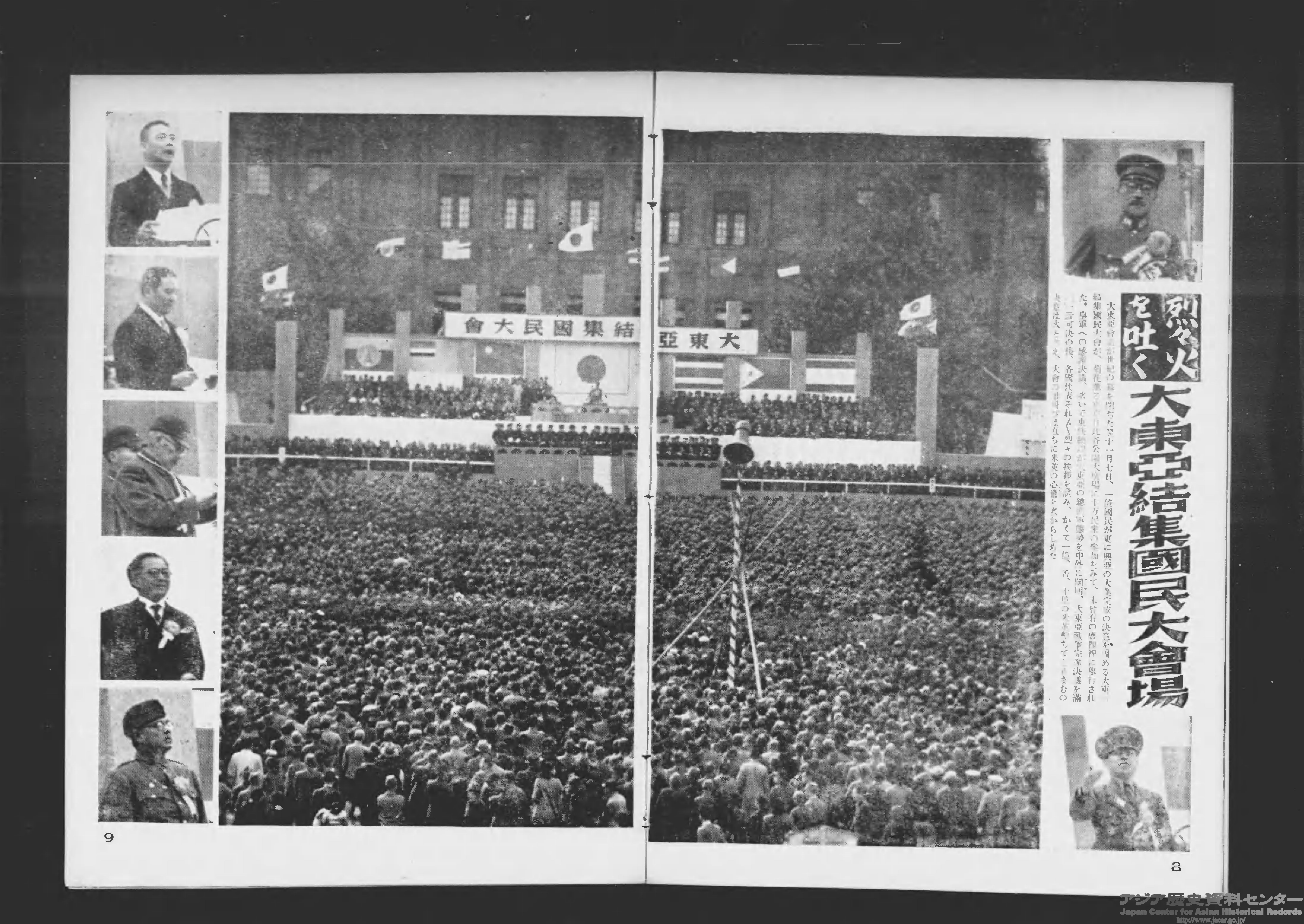 1943年11月5~6日、東京にアジア各国の首脳を集めて「大東亜会議」を開催、11月7日には日比谷公園で「大東亜結集国民大会」が開かれました。その様子は『写真週報』でも報じられています。同じ号で汪兆銘政権との日華同盟条約調印も取り上げられました(7画像目)。