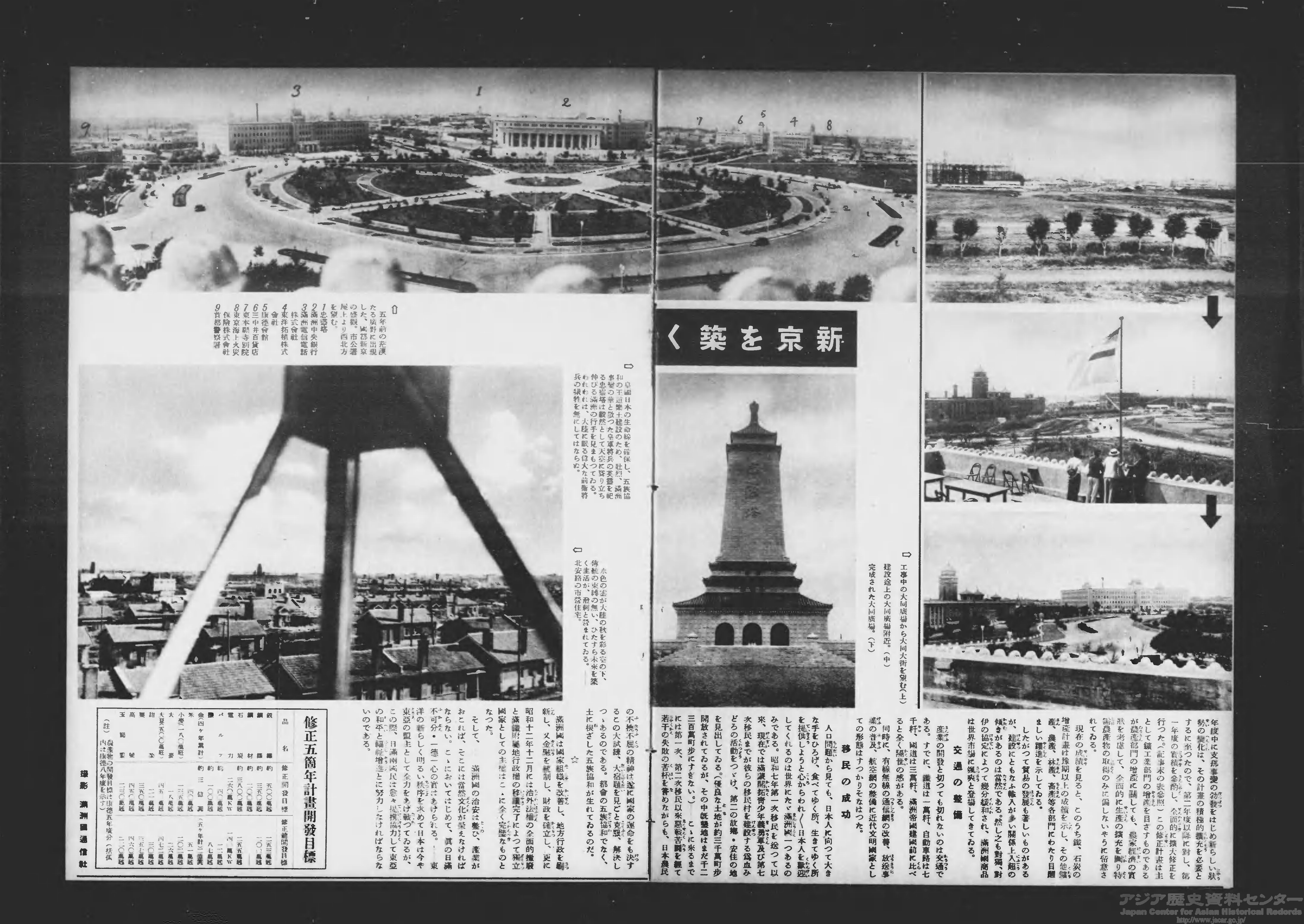画像は「満洲建設の巨歩」と表紙に記された31号(1938年9月14日)で、新京(現在の長春)の都市整備を取り上げた記事。