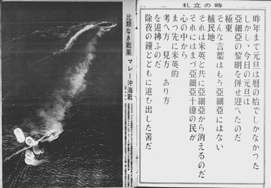 資料2は、昭和16年(1941年)12月31日付の『写真週報』201号です。ここでは攻撃をうけたプリンス・オブ・ウエールズとレパルスの写真が掲載されています(2画像目)。