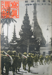 その後、表紙写真には、基本的に戦争に関連する事柄をより直接に表現する写真が多く用いられるようになります。左上の写真は、昭和17年(1942年)4月1日付の『写真週報』214号の表紙です。ここにはビルマのラングーンに進駐する日本軍の写真が用いられています。中央の写真は、昭和18年(1943年)5月26日付の『写真週報』273号の表紙です。巻末には、この表紙について次のような解説が付されています。 「束になつて出てこいと、敵艦隊撃滅に満を持すわが主力艦隊は、太平洋上に厳として存在する。 敵が主力艦十三隻を失つて海上兵力に致命的な打撃をうけてゐるにも拘はらず(注−かかわらず)、わが主力艦隊の健在は、第三十八回の海軍記念日を迎へ、帝国海軍の光彩陸離(注−りくり きらきら輝く様子)たるものがある。」 しかし実際には、前年の昭和17年(1942年)6月5日のミッドウエー海戦で日本海軍は空母4隻等を失い海軍力を大幅に低下させており、またこの『写真週報』273号の発行日のおよそ1ヶ月前にあたる昭和18年(1943年)4月18日には、連合艦隊司令長官山本五十六が前線の視察中に搭乗機をブーゲンビル島上空で撃墜され戦死していました。(この間の経緯については、年表の項目をご参照下さい)。 右上の写真は、昭和18年(1943年)10月20日付の『写真週報』294号の表紙です。同年10月1日付で公布された「在学徴集延期臨時特例」による学生の徴兵猶予措置のほぼ全面的な撤廃をふまえ、軍事教練に参加する学生の写真が用いられています。