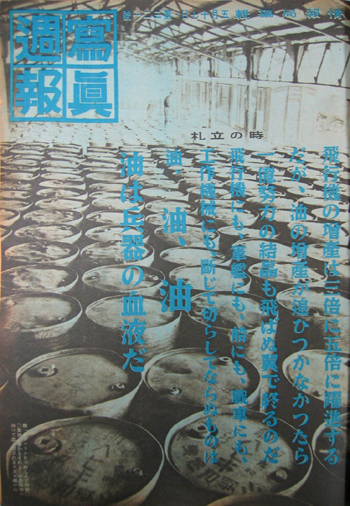 昭和16年(1941年)12月8日、日本軍がマレー半島上陸、ハワイの真珠湾攻撃を開始し、太平洋戦争(「大東亜戦争」)の火蓋が切られると、『写真週報』の表紙にもより直接的にこの開戦の模様に関する写真が掲載されます。左上の写真は、対米英開戦をつたえる最初の号となった昭和16年(1941年)12月17日付の『写真週報』199号の表紙です。ここには「一億、今ぞ 敵は米英だ!」という標語が付されています。 中央の写真は、昭和16年(1941年)12月24日付の『写真週報』200号の表紙です。この号の巻末には表紙について次のような解説が付されています。 「太平洋上における米英の主力艦隊を、開戦僅か三日にして殲滅した我が聯合艦隊航空部隊の威武は燦(注−さん)として中外に宣揚された。 いましもわが新鋭艦上戦闘機は密雲をついて敢然攻撃に向ふ」 右上の写真は、昭和16年(1941年)12月31日付の『写真週報』201号の表紙です。