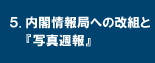 資料5は、昭和15年(1940年)9月28日付の「情報局機構案」です。資料2、資料4と異なり、ここでは『写真週報』の編輯出版が、「検閲」を担当する第四部のうち、「編輯」を担う第二課の管轄とされています。12月に発足した内閣情報局でも、この案と同じく第四部第二課が『写真週報』を管轄しています。