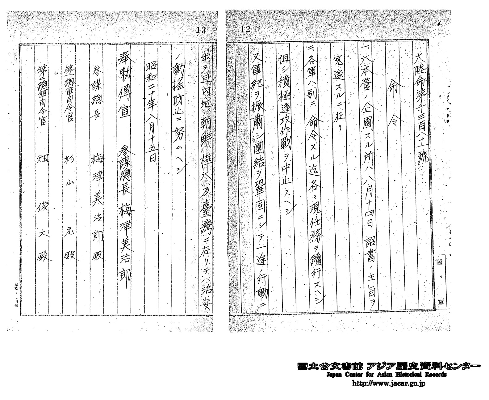 このような状況下で天皇の「詔書」と軍中央の指導力が大きな役割を果たします。天皇の命による、終戦の詔書(件名「御署名原本・昭和二十年・詔書八月十四日・大東亜戦争終結ニ関スル詔書」Ref. A04017702300)では「朕ハ茲ニ国体ヲ護持シ得テ」と記され「国体護持」について確信があることが示されていました。また、8月15日に大本営陸軍部が陸軍大臣と参謀総長の連名において陸軍全軍に向けて発出した「戦争終結の件」という電報においては、天皇の「聖断」によりポツダム宣言を受諾することが記してありました。これは、本土決戦に備えていた陸海軍、特に陸軍の武装解除と復員を円滑に実施し得た大きな理由となります。大本営は終戦の決定後は速やかに戦争継続から降伏と軍の復員に業務を転換し計画を整えていきます。