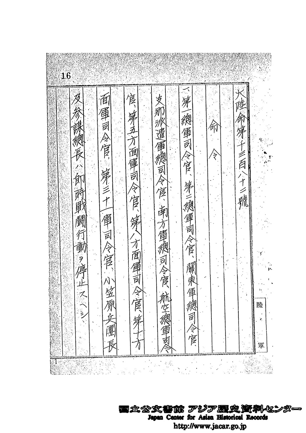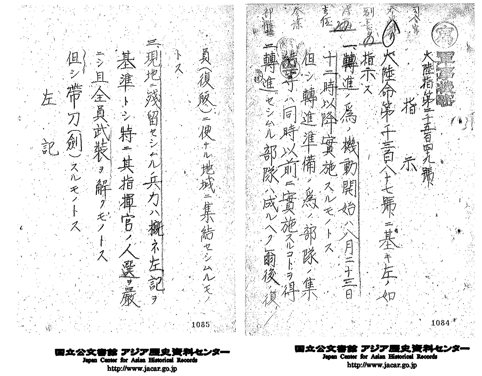 陸海軍は、8月15日から19日にかけて、「積極進攻作戦停止」(【資料1-1】)、「戦闘行動の即時停止」(【資料1-2】)、「第一線各軍の作戦任務解除」に関する命令を出し、まずは停戦を行い、次いで降伏と武装解除の準備に入ります。これらの命令により陸海軍の各部隊は停戦と部隊集結を開始します。