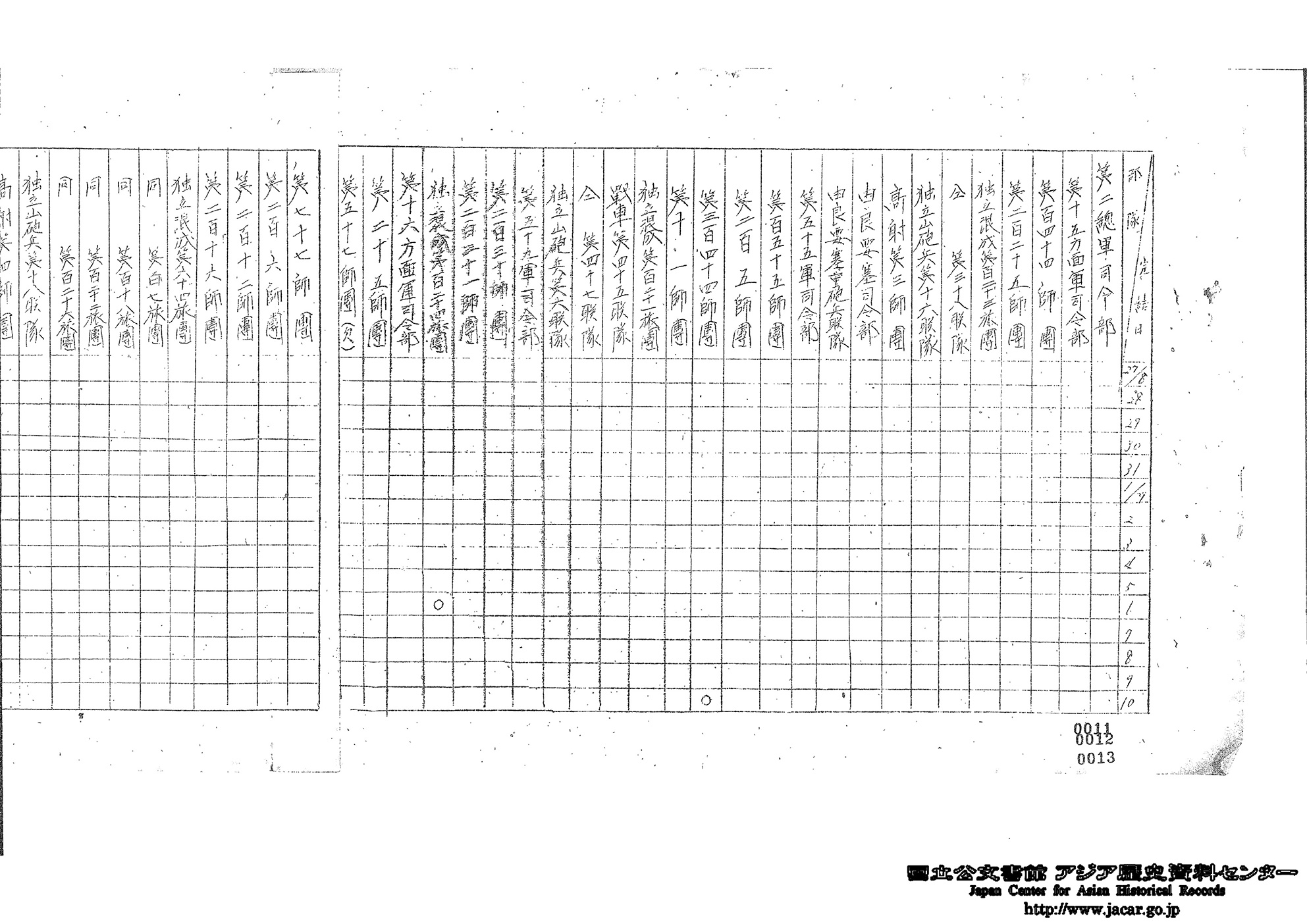 アジ歴では、日本側が連合軍へ提出した復員に関する資料、簿冊「昭和20年9月以降 連合軍提出書類「復員に関する綴」 (其の1) 軍事課調査班」(Ref. C15011153200)を閲覧できます。【資料1-12】は、陸軍省軍事課が、8月27日から9月10日までの第一総軍隷下の「内地」野戦部隊の復員状況をまとめたものです。同じように、【資料1-13】は第二総軍隷下の「内地」野戦部隊の復員状況がまとめられています。
