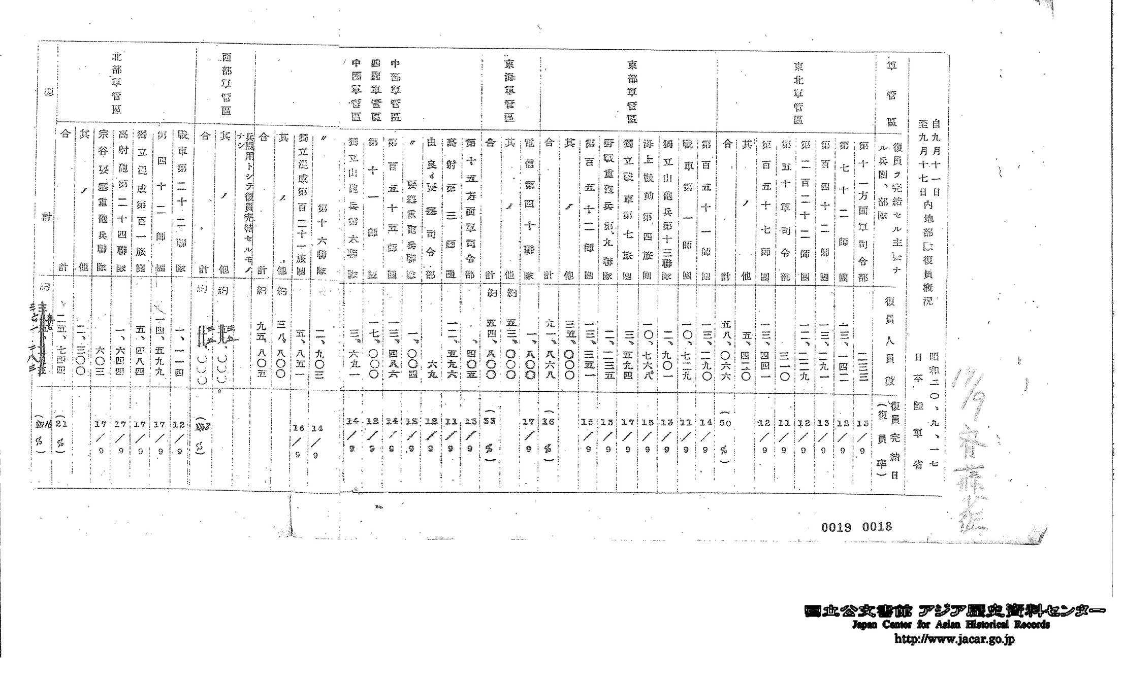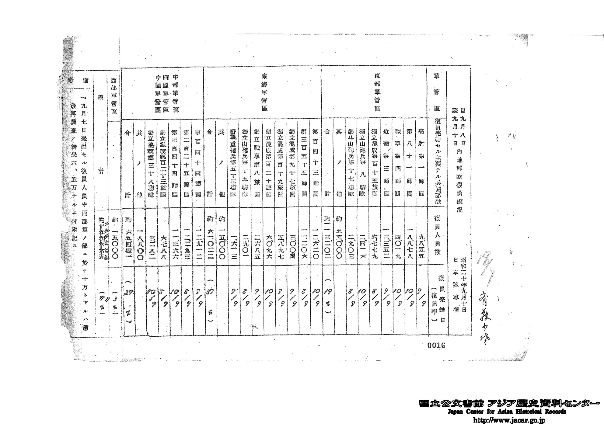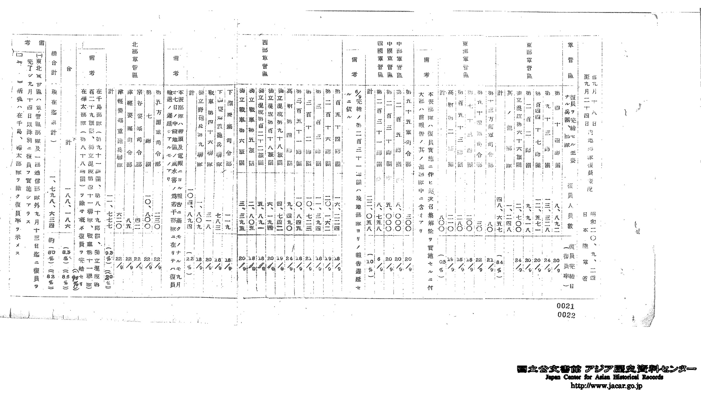 「内地」陸軍部隊の復員は計画通り進んでいき、9月末までに各官衙・学校・軍隊の残務処理要員や復員業務に従事している通信部隊、部隊の整理・警備などに当たっていた歩兵補充隊を除いて復員を完結しました(件名「6.昭和20年10月1日 日本陸軍省 在内地諸部隊復員状況一覧表」、Ref. C15011154100)。