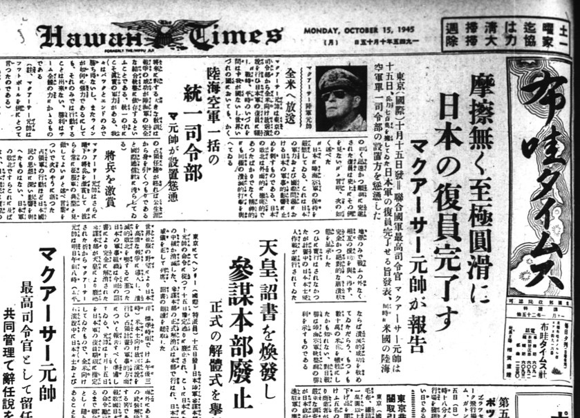 また、ハワイで発行されていた日本語新聞『布哇タイムス』1945年10月15日の紙面にも、「摩擦無く至極円滑に日本の復員完了す」という見出しの記事が掲載されています(【資料1-19】)。この記事にはマッカーサーが東京の司令部から全米に向けておこなった放送演説が紹介されており、マッカーサーが日本軍の復員に関し、「戦時、平時のいづれを問はず我が国ないし世界いづれの国においても、かくの如く迅速かつ順調に完遂された復員は史上にその例を見ない」と言明した、と報じています。このように、終戦後の「内地」所在部隊の復員は極めて円滑におこなわれました。