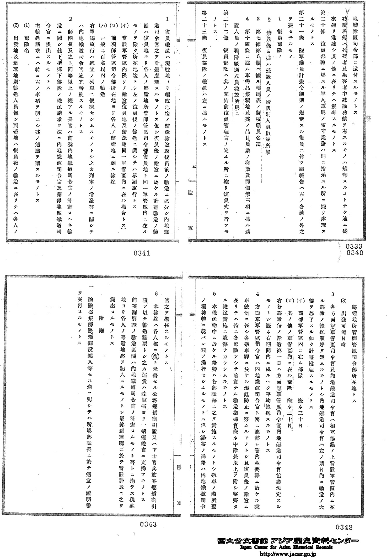 8月18日、総復員のための帝国陸軍復員要領(昭和20年8月18日軍令陸甲第116号)が制定され、23日に帝国陸軍復員要領細則(昭和20年8月18日陸機密第369号)が示達されました(【資料1-4】)。以下それぞれ「要領」、「細則」と略称します。