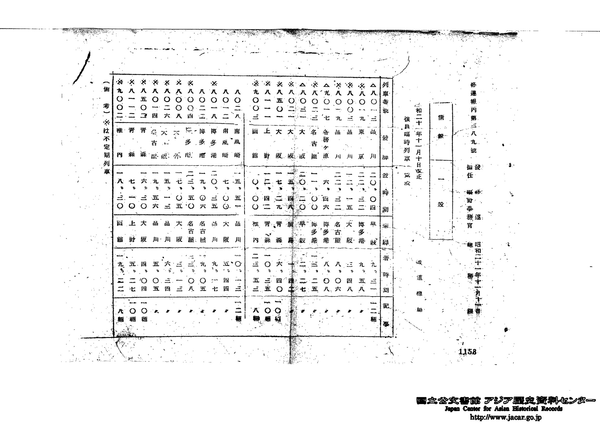 復員輸送は、現駐地から編成地まで帰還する輸送(復員前の輸送)と、編成地から帰還地所管師管区司令部までの輸送(復員後の輸送)という2つに分けられます。輸送の範囲は、各人の帰還地所管師管区司令部の所在地までとされ、それ以降は単独旅行と決められました。単独旅行とはいえ大勢が移動するので、内地鉄道司令官は列車の増発などを適宜斡旋するものと定められました。復員にかかる列車の増発について、現在、当センター内に保有している資料はあまり多くありませんが、1946年11月10日時点の復員臨時列車一覧表(【資料1-6】)や、1947年5月13日時点の復員列車(急行列車)時刻表(【資料1-7】)などを閲覧することができます。