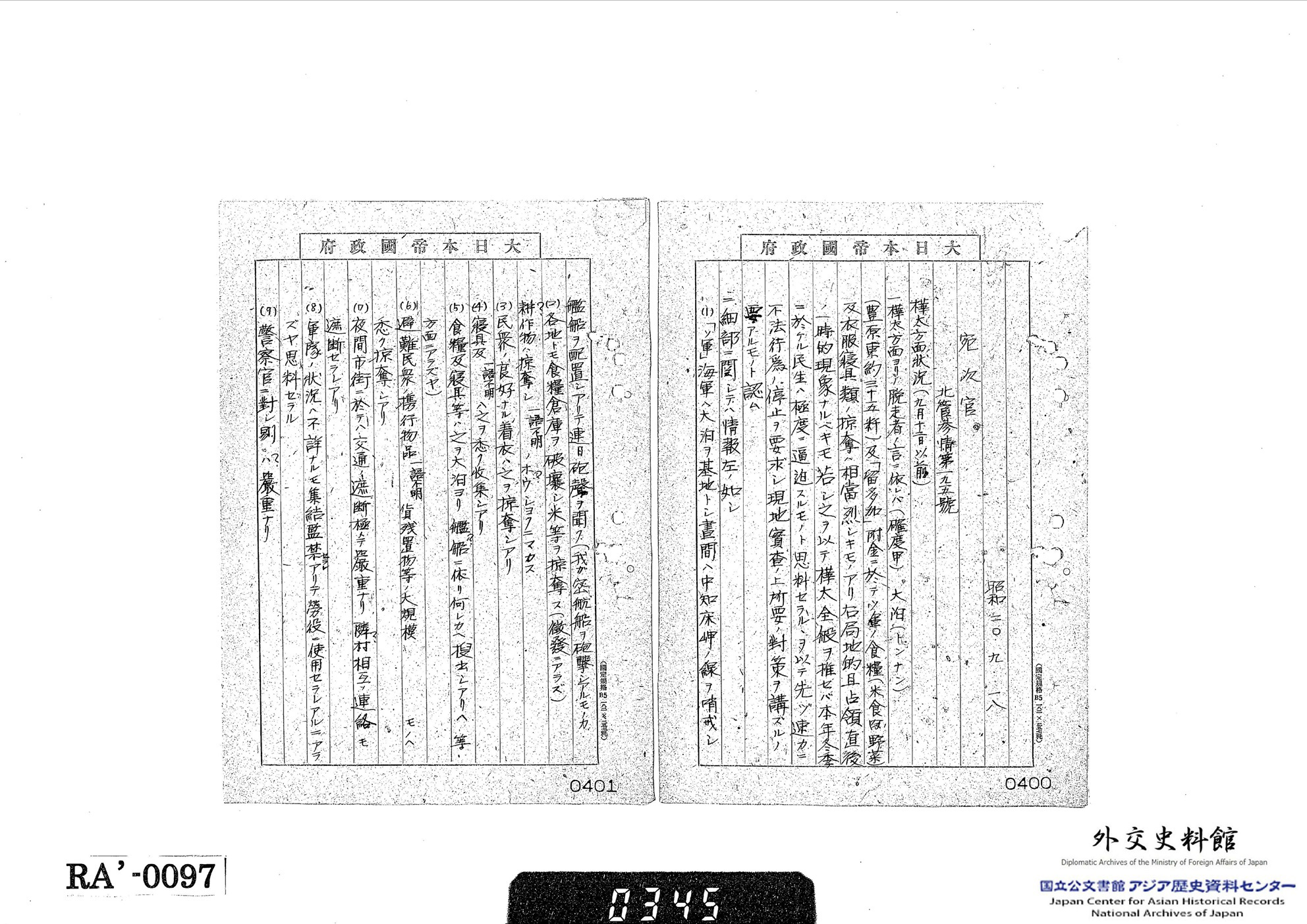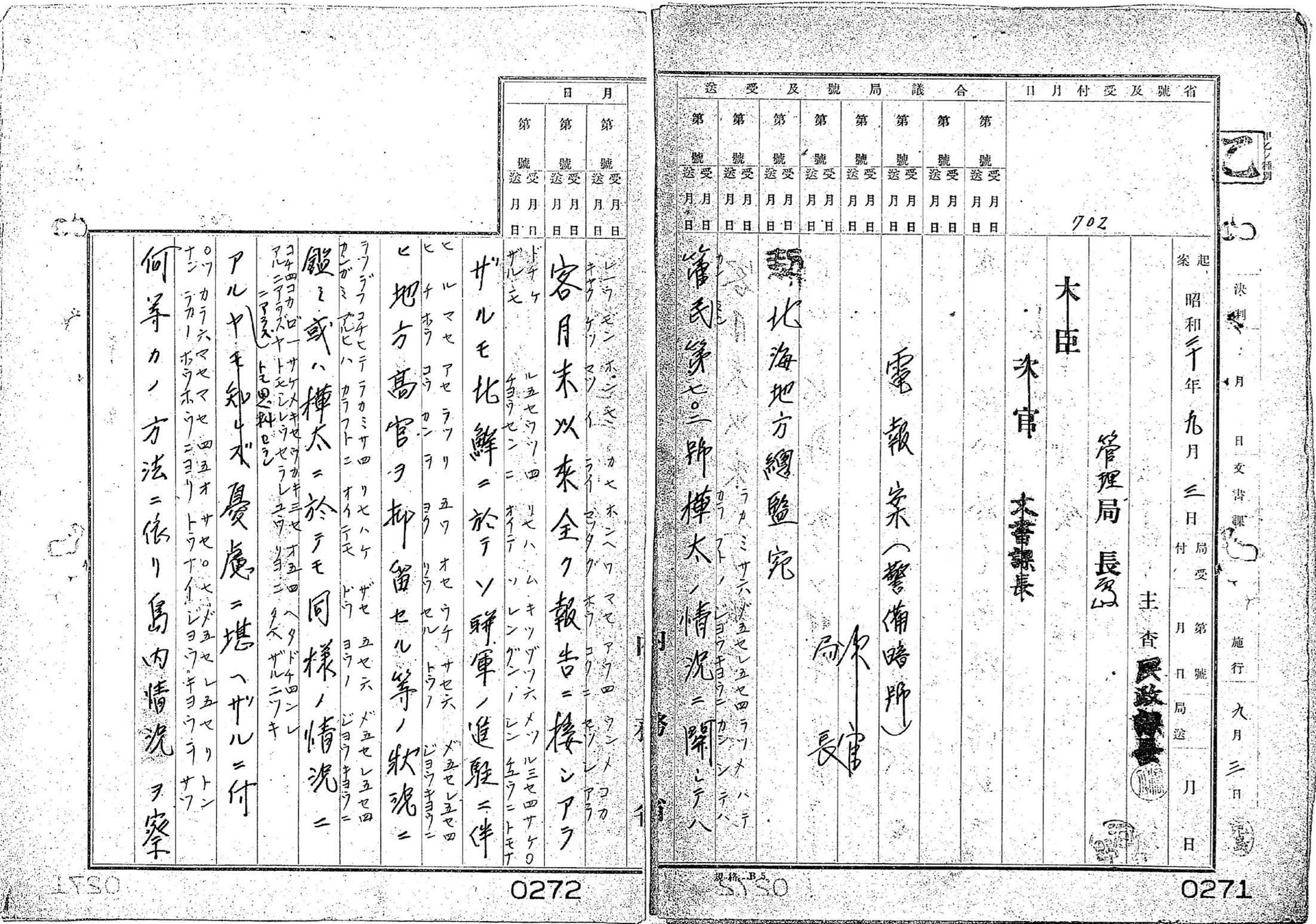 ソ連軍が進駐を完了すると南樺太と日本本土の間の連絡は困難となりました。北海地方総監に宛てられた内務省の電報案には、「樺太ノ情況ニ関シテハ客月[8月]末以来全ク報告ニ接シアラザル」、「憂慮ニ堪ヘザル」(【資料3-2】)と述べられています。