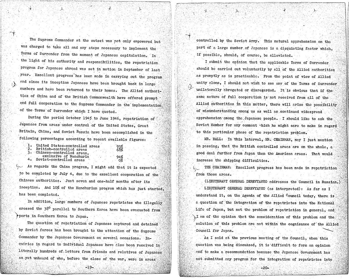 南樺太を筆頭としてソ連管理区域からの復員と引揚は遅々として進みませんでしたが、GHQ(連合国軍総司令部)の管理下に置かれていた日本政府にできることほとんどありませんでした。しかし米ソ対立が次第に表面化するなかで、アメリカがこの問題を取り上げ始めます。例えば、1946年6月26日に開催された対日理事会の第8回会合では、議長を務めるジョージ・アチソン駐日アメリカ大使が、日本兵の速やかな復員を進めるというポツダム宣言の条項を取り上げました。そのうえで彼は、ソ連管理区域からの日本人の帰還が進まないことについて、日本政府や該当者の親族などが「当然の不安(the natural apprehension)」を抱いていると述べたのです(【資料3-5】、【資料3-6】)。