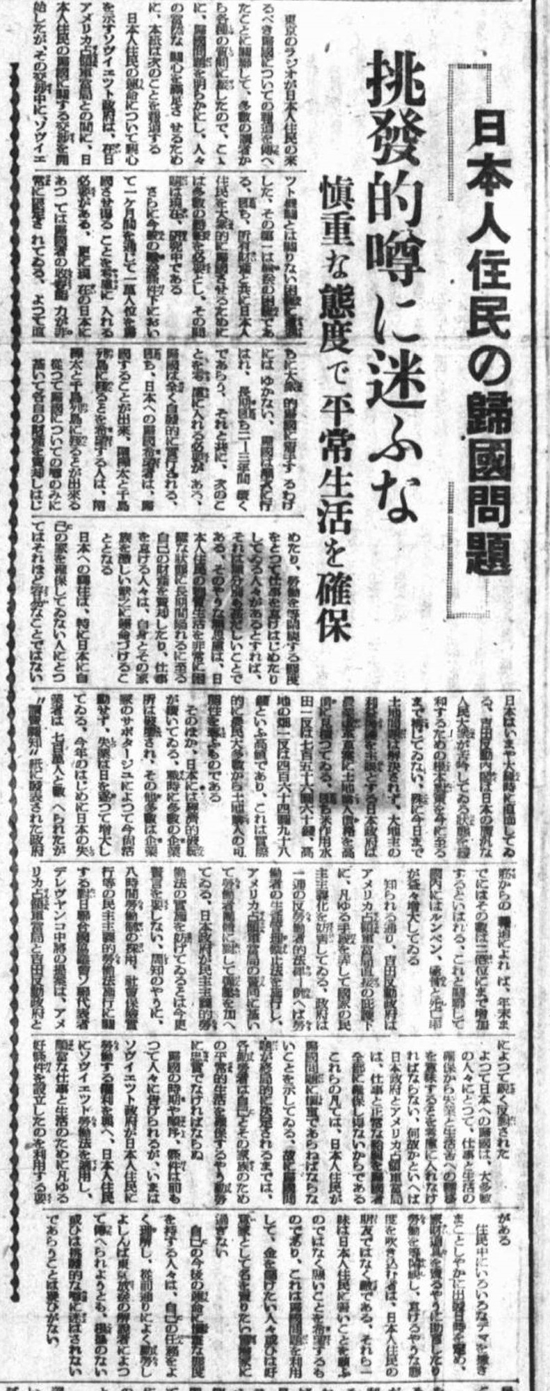 以上のように最初の公式引揚は比較的順調に終わりました。もっとも、ソ連当局による1946年7月付の統計は、南樺太に残留していた戦前からの住民を約30万5800人と見積もっており、5000人という人数はごく少数に過ぎなかったといえるでしょう。事実、南樺太引揚はその後も長きにわたり続くこととなります。そもそも、経済的観点から現地住民の引揚をなるべく引き延ばしたいというソ連現地当局の意図に変化はなかったのです。そのような姿勢は、ソ連軍の指導下で発行されていた現地邦字新聞『新生命』からも読み取ることができます。1946年10月15日に掲載された「日本人住民の帰国問題」(【資料3-9】)と題する記事は、日本人の引揚が遅れている原因は「輸送の困難」と日本側における「帰国者の収容能力」の低さであるとしてソ連側の責任を暗に否定しつつも、「帰国希望者は帰国することが出来」ると述べています。しかし同時に日本国内は経済的にも政治的にも悲惨な状況にあるとし、それゆえ日本人住民は「帰国問題に慎重であらねばなら」ず、むしろソ連政府が日本人住民のために「順当な仕事と生活のために凡ゆる好条件を設立したのを利用」しなければならないとしているのです。同様の趣旨は第二次公式引揚が開始された翌1947年4月の社説でも繰り返されています。その主張するところによれば、南樺太の日本人住民には「自分と家族を幾多の欠乏に陥入れる日本に帰るか、或ひは日本人住民に労働と安定した生活のために諸条件を与へているソヴイエツト政府の博愛のもとに、南樺太に残るか」という「自発的選択の自由」が与えられているのでした(『新生命』1947年4月10日)。