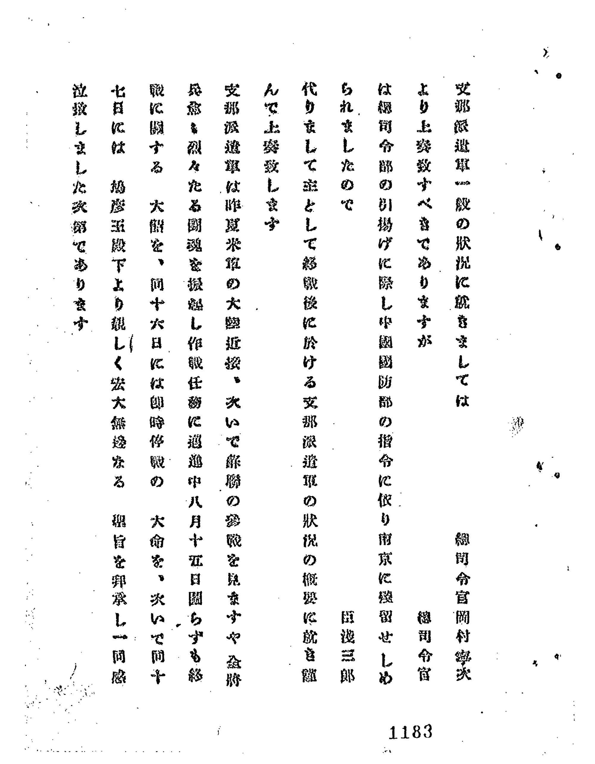 8月15日、支那派遣軍総司令部の職員約2000名は、司令部の広場で玉音放送を聞き、終戦を実感することになります。放送が終わると、同軍総司令官岡村寧次は承詔必謹(天皇の命令に必ず従うこと)を訓示し、支那派遣軍として終戦を受け入れることを表明しました。翌16日には、大本営から即時停戦の命令が到着、支那派遣軍はこれに従い、複雑な心境を抱きつつも、国民政府側との停戦交渉などの終戦処理に従事することとなります。