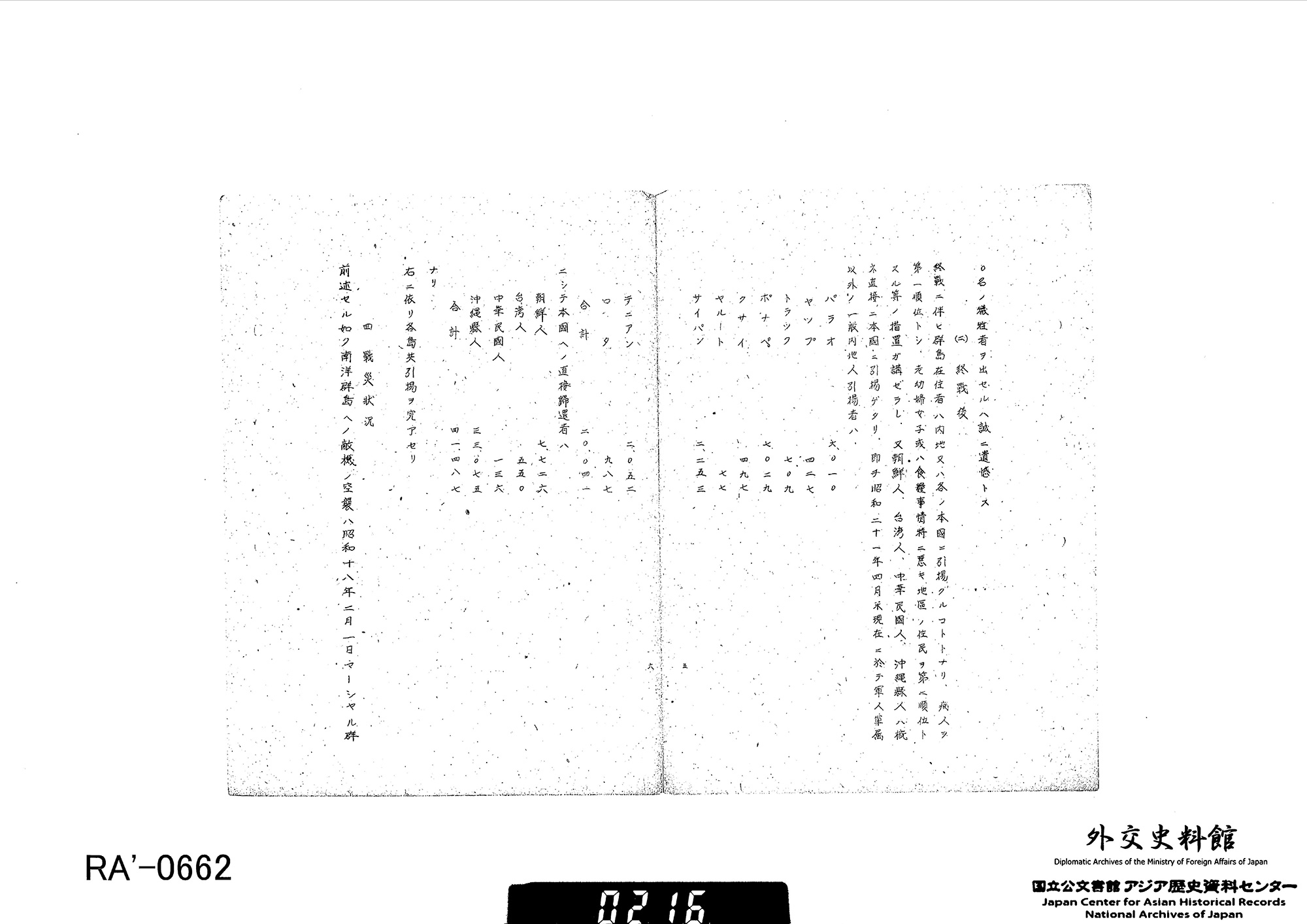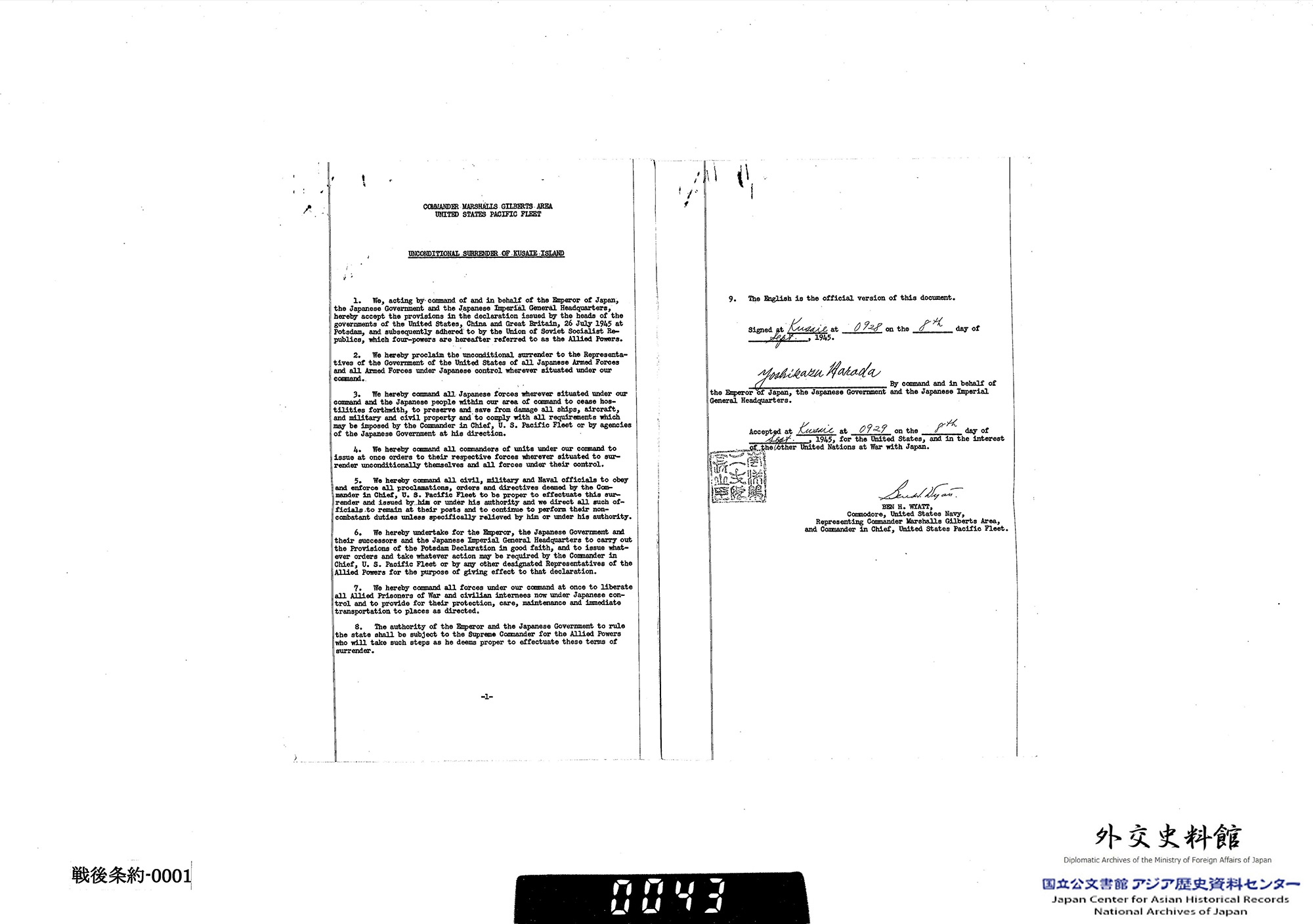 1945年8月、ポツダム宣言受諾に伴い日本による南洋群島の委任統治は事実上終了しました。主要各島では、日本軍の所在指揮官が、現地の米軍指揮官に対して降伏を行いました。たとえば、同年9月2日、パラオ島では地区集団司令官(第14師団長)の井上貞衛が、米国司令官ロジャースに対し降伏文書に調印しています。また、東カロリン群島クサイ島(現・ミクロネシア連邦コスラエ州)では、同月8日に原田義和陸軍中将が、マーシャル・ギルバート方面司令代理ベン・ワイアットに対して降伏文書を調印しました(【資料9-2】)。