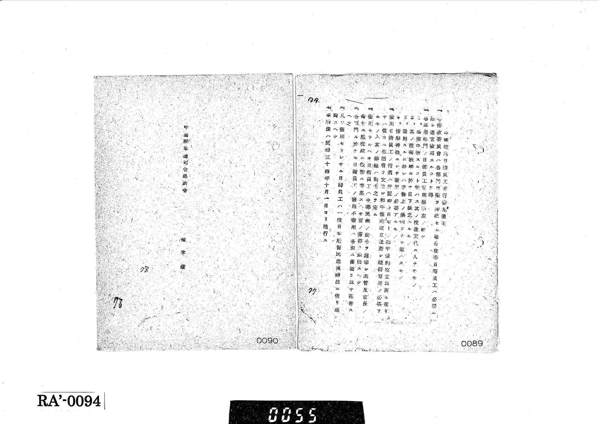 9月30日、中国戦区陸軍総司令部は「政字第21号」訓令を下達し、技術者の留用基準と待遇を定めた「中国境内日籍員工暫行徴用通則」が10月1日から施行されました(【資料T2-4】)。この通則では、各接収委員会が日本の工場や公的機関を接収する際、技術を代替できる人がいない場合や中国で不足している技術の場合、徴用しなければ業務が整理できない場合、特殊な状況で徴用が必要な場合に限り、日本人技術者を徴用できると定められました。徴用された技術者の待遇については、連合国と日本との平和条約成立までは生活費が支給され、平和条約成立後に継続雇用が必要な場合は給与を別途定めるとしています。