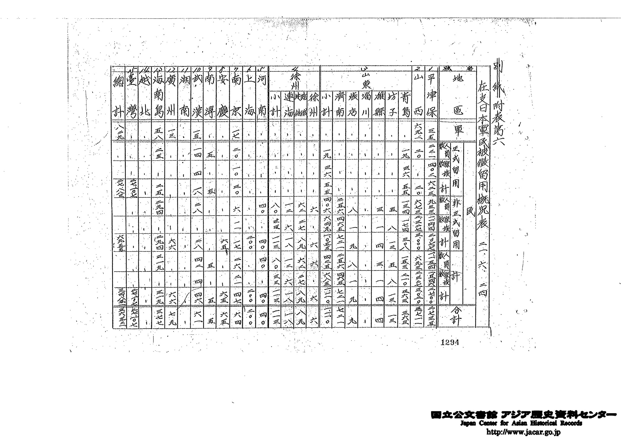 では、一体どれくらいの日本人技術者が中国に留用されたのでしょうか。アジ歴にある支那派遣軍が作成した統計史料によれば、1946年6月時点で、東北部(旧満洲)を除いて、合計3万6521人の軍民とその家族が中国に残留しています(【資料T2-9】)。国民政府国防部も前述の10月会議に向けて各機関から留用者名簿を集め、「徴用日籍技術員人数表」を作成しました。それによれば、中国各地に留用された技術者及びその家族の総計は4万5254人に達しました(【資料T2-10】)。