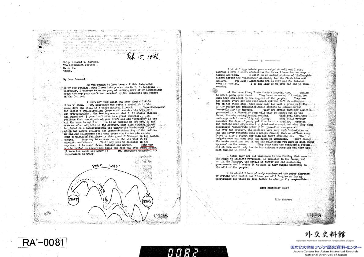 外務省は終戦直後から帝国憲法の改正を予期し、独自に調査研究を進めていたが、「帝国憲法改正関係一件」には、外務省における憲法構想、GHQと日本政府(終戦連絡事務局)との来往信綴、松本憲法担当大臣の「憲法改正私案」、白州次郎終戦連絡事務局参与がGHQ民生局に宛てた書簡などが収録されている。なかでも白州書簡は「ジープウエイ・レター」として知られ、日本側の憲法構想は「国情に沿った道筋(ジープウエイ)」であるべきことを図で示している。