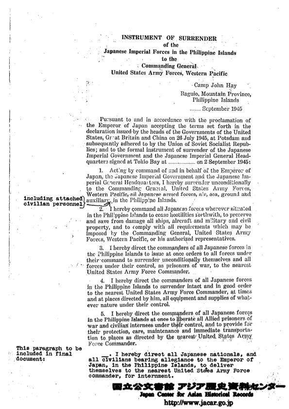 「INSTRUMENT OF SURRENDER of the Japanese Imperial Forces in the Philippine Islands to the Commanding General United States Army Forces, Western Pacific」JACAR(アジア歴史資料センター)Ref.C14020716900、ルソンにおける降伏文書(防衛省防衛研究所)、1画像目