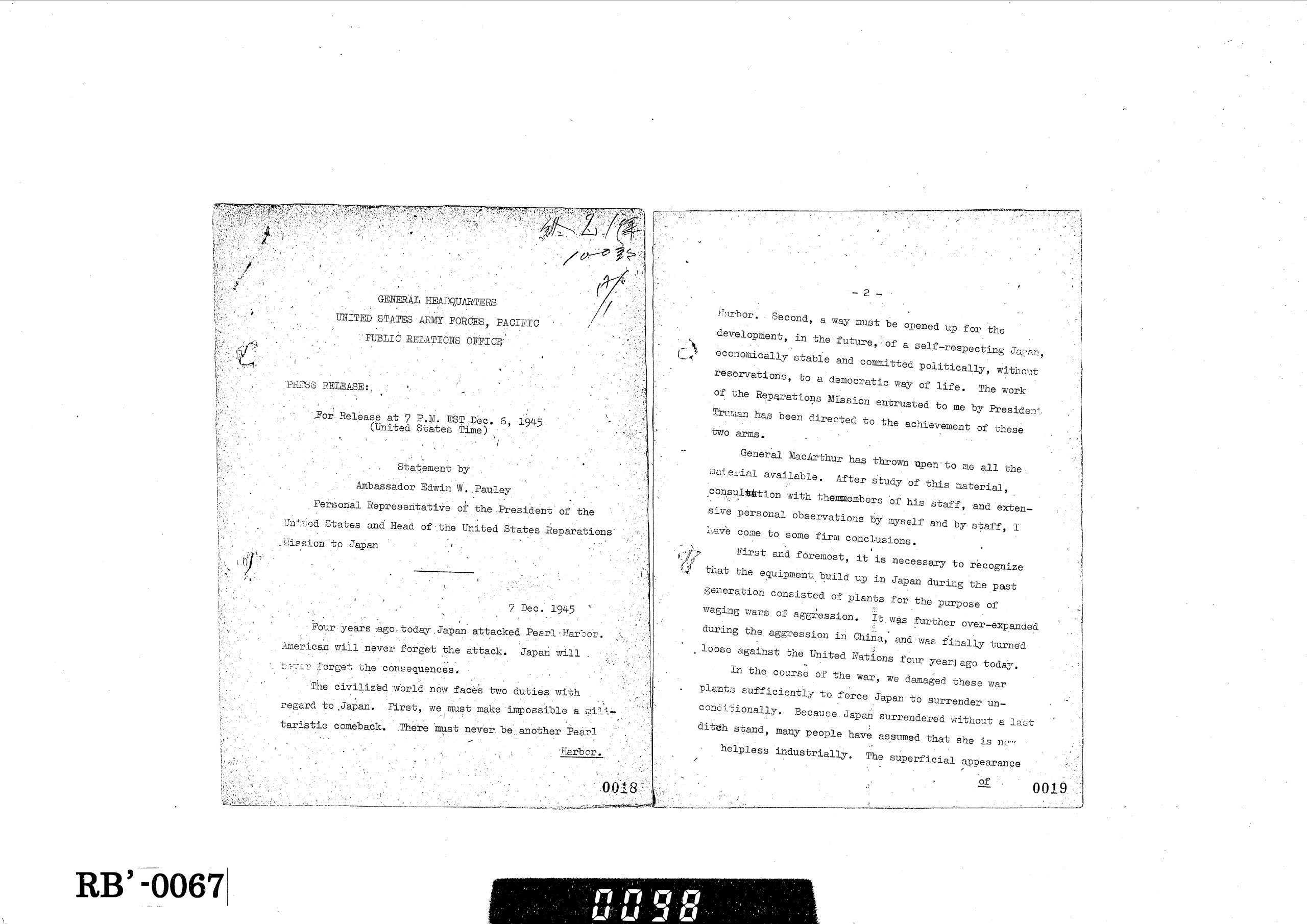 「2.ポーレー大使声明(一九四五・一二・七)」JACAR(アジア歴史資料センター)Ref.B19010370200、占領下の対日賠償関係 ポーレー大使来朝関係(B’.3.1.1.1-3)(外務省外交史料館)、2画像目