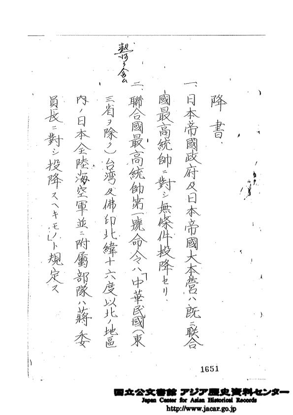 「降書」JACAR(アジア歴史資料センター)Ref.C13070337700、第1軍司令部備忘録綴 昭和20年(防衛省防衛研究所)、1画像目